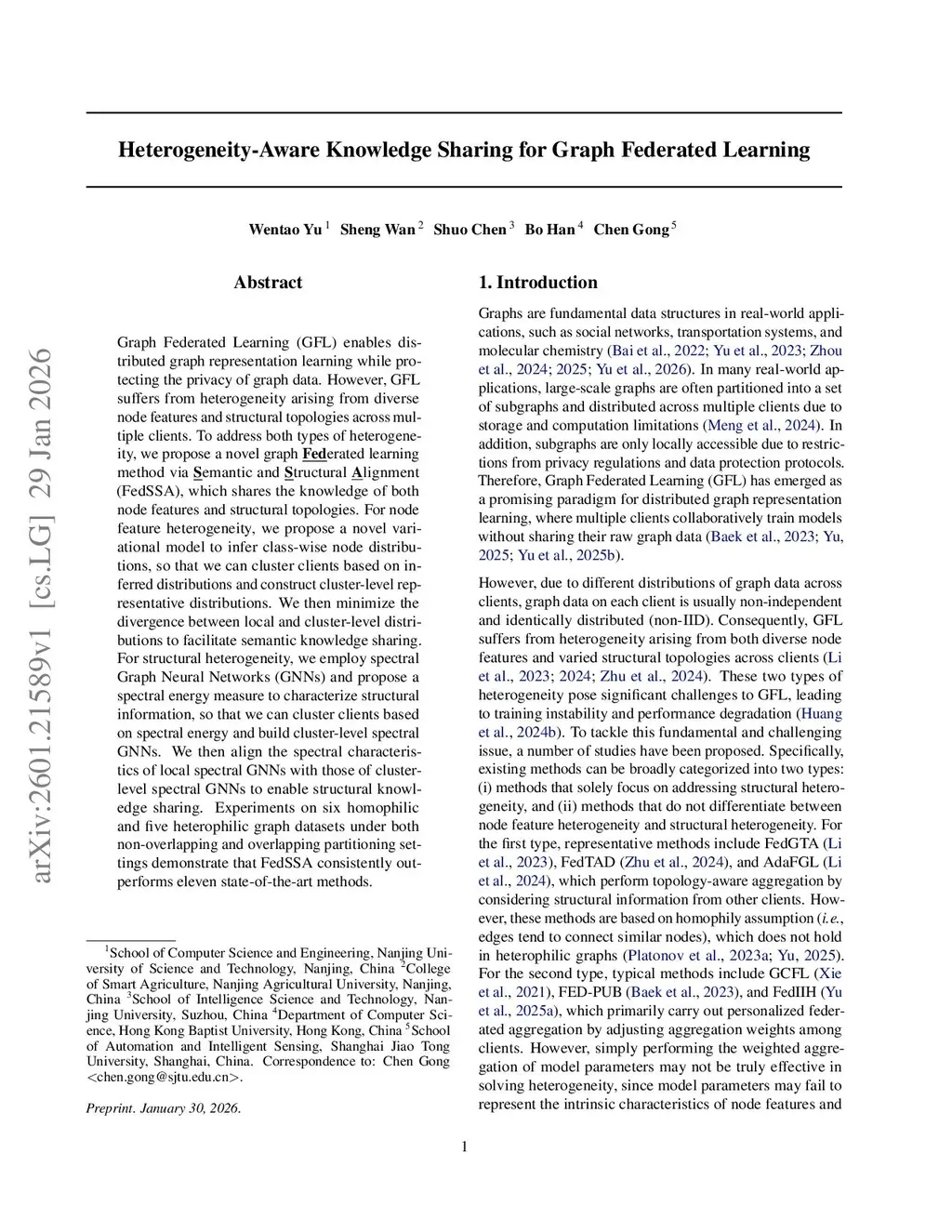 Graph Federated Learning (GFL) enables distributed graph representation learning while protecting the privacy of graph data. However, GFL suffers from heterogeneity arising from diverse node features and structural topologies across multiple clients. To address both types of heterogeneity, we propose a novel graph Federated learning method via Semantic and Structural Alignment (FedSSA), which shares the knowledge of both node features and structural topologies. For node feature heterogeneity, we propose a novel variational model to infer class-wise node distributions, so that we can cluster clients based on inferred distributions and construct cluster-level representative distributions. We then minimize the divergence between local and cluster-level distributions to facilitate semantic knowledge sharing. For structural heterogeneity, we employ spectral Graph Neural Networks (GNNs) and propose a spectral energy measure to characterize structural information, so that we can cluster clients based on spectral energy and build cluster-level spectral GNNs. We then align the spectral characteristics of local spectral GNNs with those of cluster-level spectral GNNs to enable structural knowledge sharing. Experiments on six homophilic and five heterophilic graph datasets under both non-overlapping and overlapping partitioning settings demonstrate that FedSSA consistently outperforms eleven state-of-the-art methods.