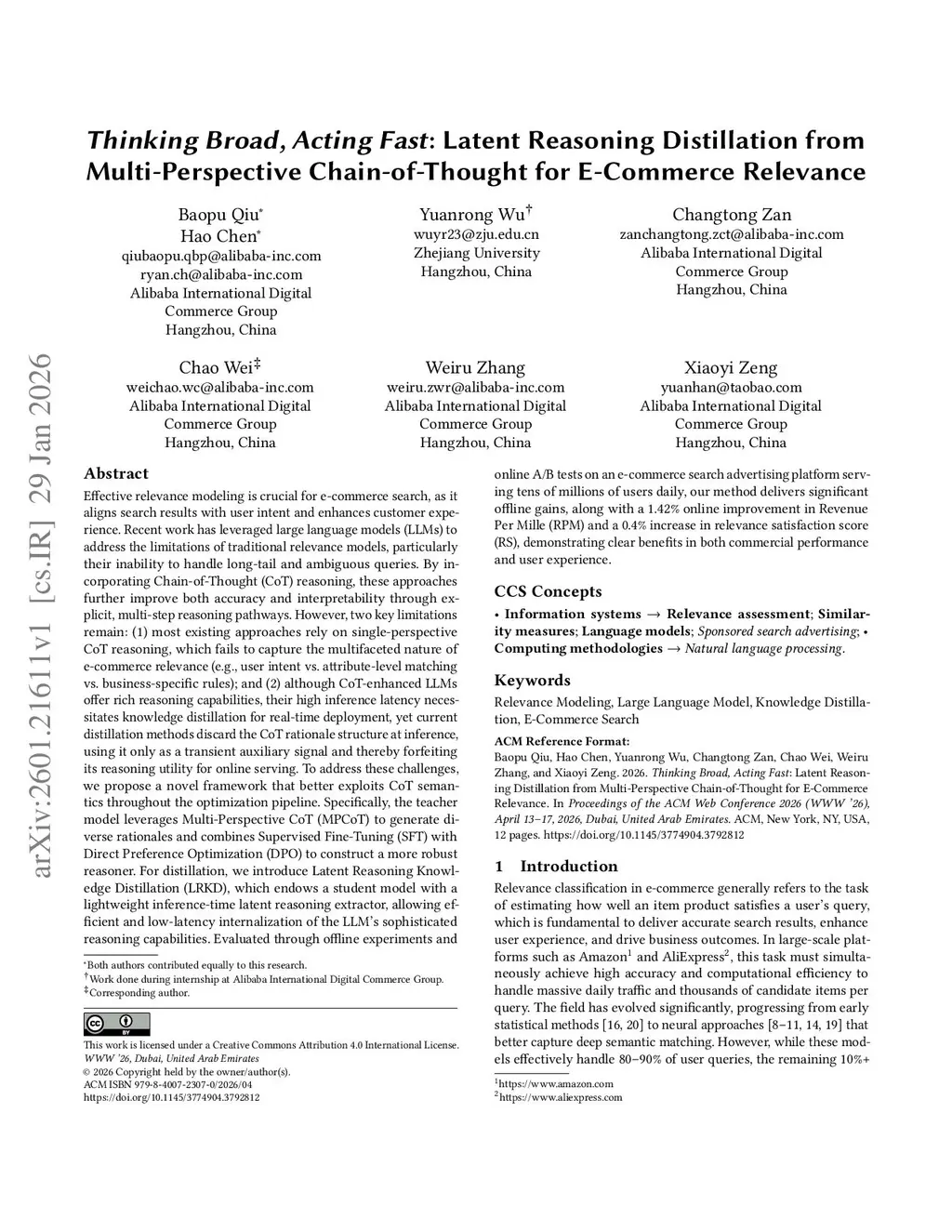 Effective relevance modeling is crucial for e-commerce search, as it aligns search results with user intent and enhances customer experience. Recent work has leveraged large language models (LLMs) to address the limitations of traditional relevance models, especially for long-tail and ambiguous queries. By incorporating Chain-of-Thought (CoT) reasoning, these approaches improve both accuracy and interpretability through multi-step reasoning. However, two key limitations remain: (1) most existing approaches rely on single-perspective CoT reasoning, which fails to capture the multifaceted nature of e-commerce relevance (e.g., user intent vs. attribute-level matching vs. business-specific rules); and (2) although CoT-enhanced LLM's offer rich reasoning capabilities, their high inference latency necessitates knowledge distillation for real-time deployment, yet current distillation methods discard the CoT rationale structure at inference, using it as a transient auxiliary signal and forfeiting its reasoning utility. To address these challenges, we propose a novel framework that better exploits CoT semantics throughout the optimization pipeline. Specifically, the teacher model leverages Multi-Perspective CoT (MPCoT) to generate diverse rationales and combines Supervised Fine-Tuning (SFT) with Direct Preference Optimization (DPO) to construct a more robust reasoner. For distillation, we introduce Latent Reasoning Knowledge Distillation (LRKD), which endows a student model with a lightweight inference-time latent reasoning extractor, allowing efficient and low-latency internalization of the LLM's sophisticated reasoning capabilities. Evaluated in offline experiments and online A/B tests on an e-commerce search advertising platform serving tens of millions of users daily, our method delivers significant offline gains, showing clear benefits in both commercial performance and user experience.