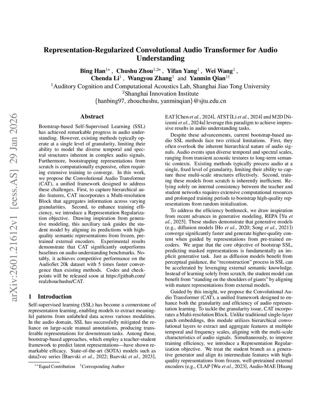Bootstrap-based Self-Supervised Learning (SSL) has achieved remarkable progress in audio understanding. However, existing methods typically operate at a single level of granularity, limiting their ability to model the diverse temporal and spectral structures inherent in complex audio signals. Furthermore, bootstrapping representations from scratch is computationally expensive, often requiring extensive training to converge. In this work, we propose the Convolutional Audio Transformer (CAT), a unified framework designed to address these challenges. First, to capture hierarchical audio features, CAT incorporates a Multi-resolution Block that aggregates information across varying granularities. Second, to enhance training efficiency, we introduce a Representation Regularization objective. Drawing inspiration from generative modeling, this auxiliary task guides the student model by aligning its predictions with high-quality semantic representations from frozen, pre-trained external encoders. Experimental results demonstrate that CAT significantly outperforms baselines on audio understanding benchmarks. Notably, it achieves competitive performance on the AudioSet 20k dataset with 5 times faster convergence than existing methods. Codes and checkpoints will be released soon atthis https URL.