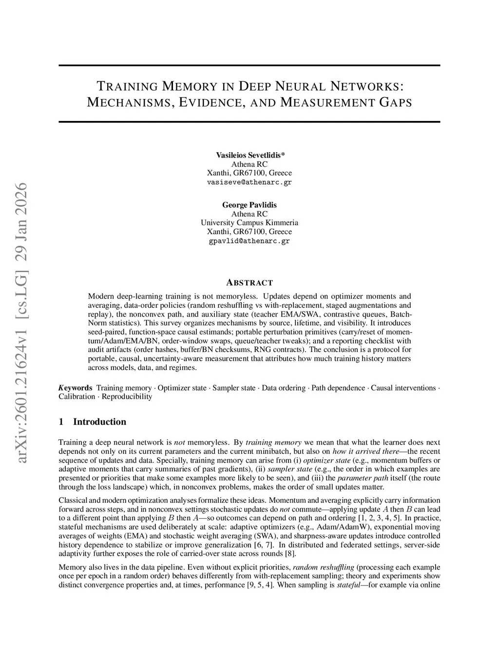 Modern deep-learning training is not memoryless. Updates depend on optimizer moments and averaging, data-order policies (random reshuffling vs with-replacement, staged augmentations and replay), the nonconvex path, and auxiliary state (teacher EMA/SWA, contrastive queues, BatchNorm statistics). This survey organizes mechanisms by source, lifetime, and visibility. It introduces seed-paired, function-space causal estimands; portable perturbation primitives (carry/reset of momentum/Adam/EMA/BN, order-window swaps, queue/teacher tweaks); and a reporting checklist with audit artifacts (order hashes, buffer/BN checksums, RNG contracts). The conclusion is a protocol for portable, causal, uncertainty-aware measurement that attributes how much training history matters across models, data, and regimes.
