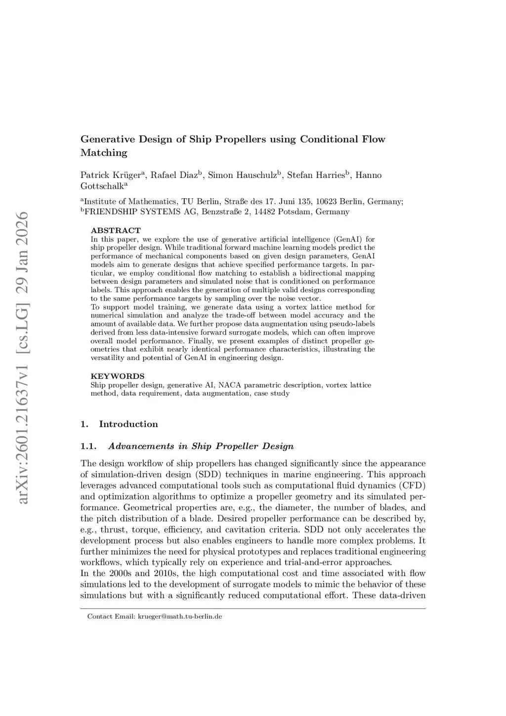 In this paper, we explore the use of generative artificial intelligence (GenAI) for ship propeller design. While traditional forward machine learning models predict the performance of mechanical components based on given design parameters, GenAI models aim to generate designs that achieve specified performance targets. In particular, we employ conditional flow matching to establish a bidirectional mapping between design parameters and simulated noise that is conditioned on performance labels. This approach enables the generation of multiple valid designs corresponding to the same performance targets by sampling over the noise vector.To support model training, we generate data using a vortex lattice method for numerical simulation and analyze the trade-off between model accuracy and the amount of available data. We further propose data augmentation using pseudo-labels derived from less data-intensive forward surrogate models, which can often improve overall model performance. Finally, we present examples of distinct propeller geometries that exhibit nearly identical performance characteristics, illustrating the versatility and potential of GenAI in engineering design.