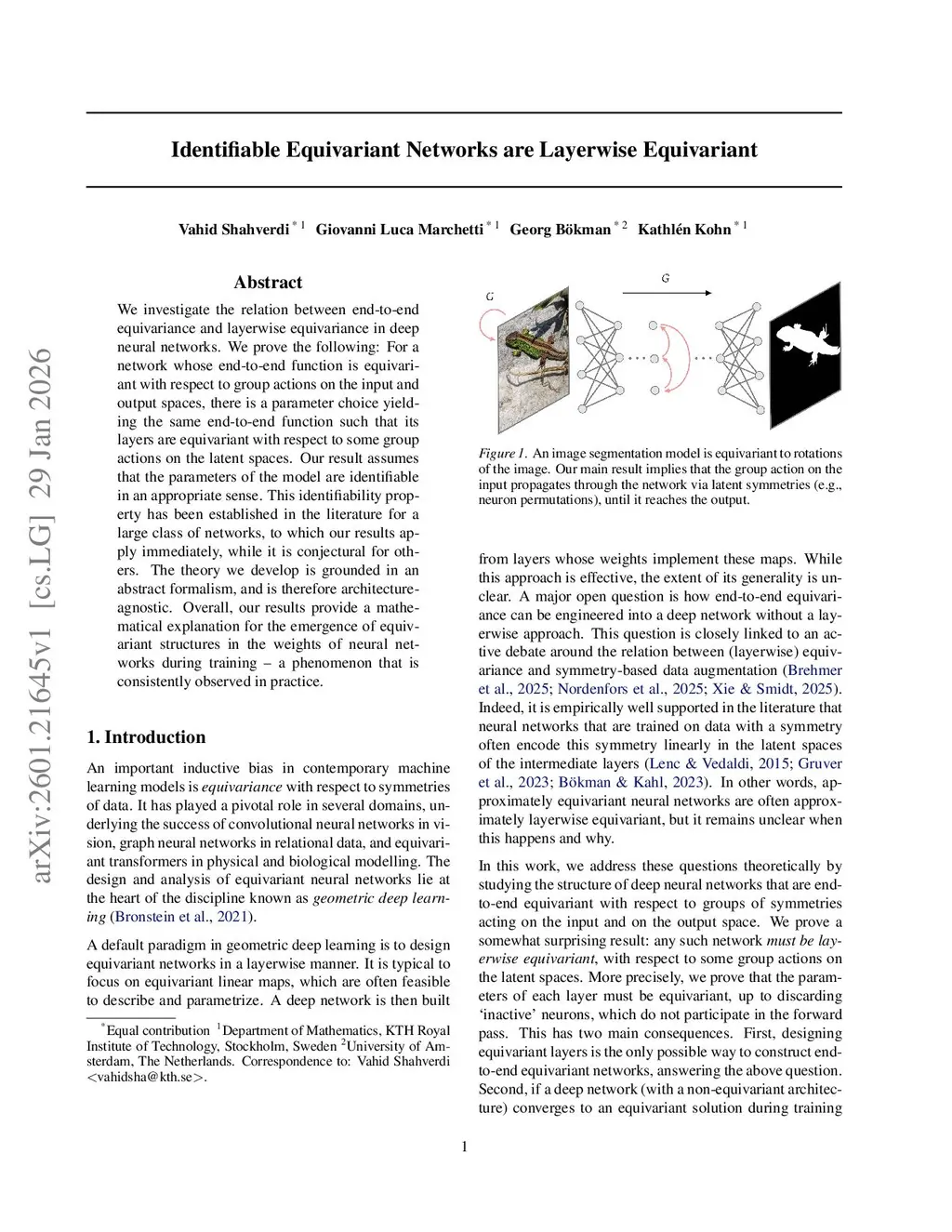 We investigate the relation between end-to-end equivariance and layerwise equivariance in deep neural networks. We prove the following: For a network whose end-to-end function is equivariant with respect to group actions on the input and output spaces, there is a parameter choice yielding the same end-to-end function such that its layers are equivariant with respect to some group actions on the latent spaces. Our result assumes that the parameters of the model are identifiable in an appropriate sense. This identifiability property has been established in the literature for a large class of networks, to which our results apply immediately, while it is conjectural for others. The theory we develop is grounded in an abstract formalism, and is therefore architecture-agnostic. Overall, our results provide a mathematical explanation for the emergence of equivariant structures in the weights of neural networks during training -- a phenomenon that is consistently observed in practice.