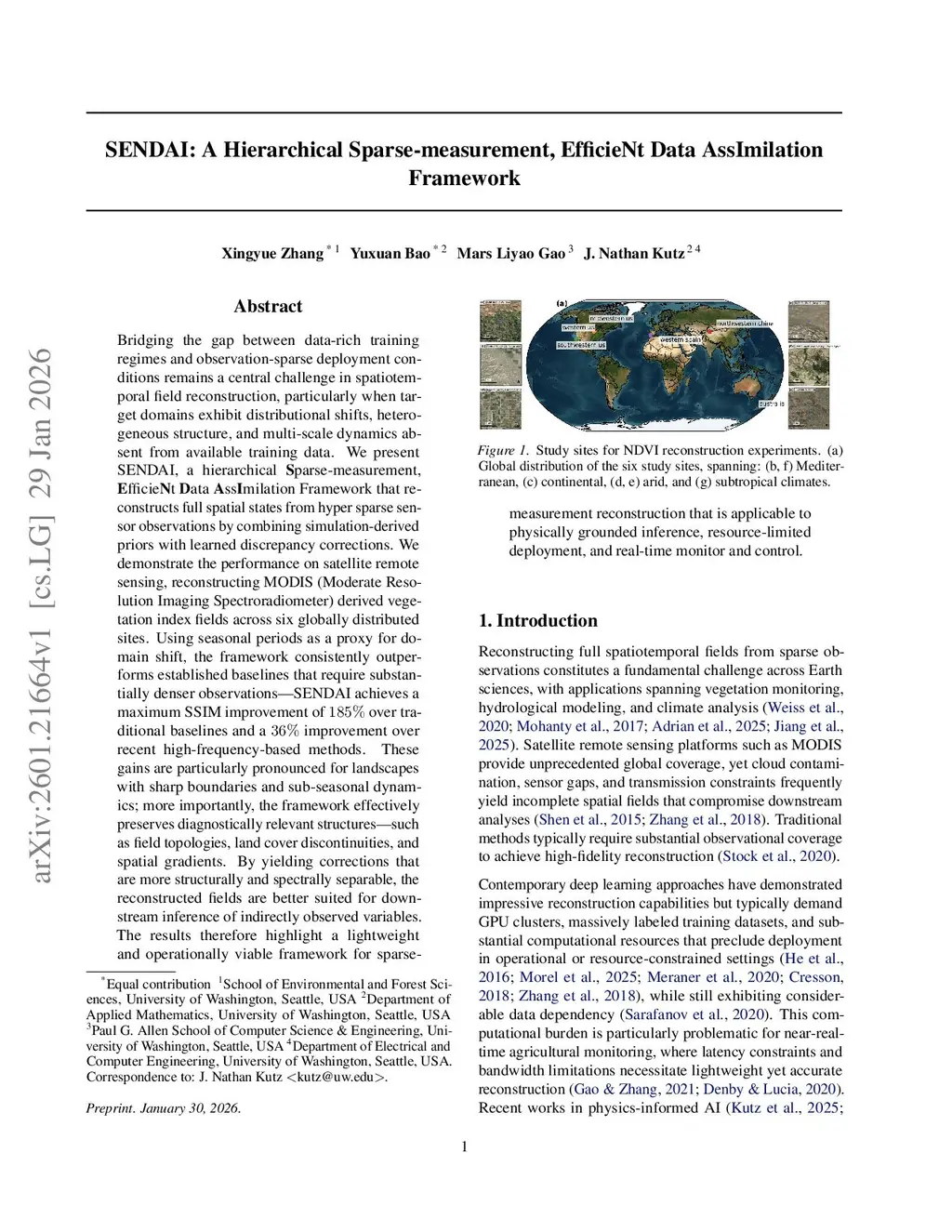Bridging the gap between data-rich training regimes and observation-sparse deployment conditions remains a central challenge in spatiotemporal field reconstruction, particularly when target domains exhibit distributional shifts, heterogeneous structure, and multi-scale dynamics absent from available training data. We present SENDAI, a hierarchical Sparse-measurement, EfficieNt Data AssImilation Framework that reconstructs full spatial states from hyper sparse sensor observations by combining simulation-derived priors with learned discrepancy corrections. We demonstrate the performance on satellite remote sensing, reconstructing MODIS (Moderate Resolution Imaging Spectroradiometer) derived vegetation index fields across six globally distributed sites. Using seasonal periods as a proxy for domain shift, the framework consistently outperforms established baselines that require substantially denser observations -- SENDAI achieves a maximum SSIM improvement of 185% over traditional baselines and a 36% improvement over recent high-frequency-based methods. These gains are particularly pronounced for landscapes with sharp boundaries and sub-seasonal dynamics; more importantly, the framework effectively preserves diagnostically relevant structures -- such as field topologies, land cover discontinuities, and spatial gradients. By yielding corrections that are more structurally and spectrally separable, the reconstructed fields are better suited for downstream inference of indirectly observed variables. The results therefore highlight a lightweight and operationally viable framework for sparse-measurement reconstruction that is applicable to physically grounded inference, resource-limited deployment, and real-time monitor and control.