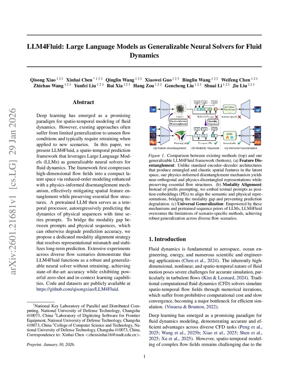 Deep learning has emerged as a promising paradigm for spatio-temporal modeling of fluid dynamics. However, existing approaches often suffer from limited generalization to unseen flow conditions and typically require retraining when applied to new scenarios. In this paper, we present LLM4Fluid, a spatio-temporal prediction framework that leverages Large Language Models (LLMs) as generalizable neural solvers for fluid dynamics. The framework first compresses high-dimensional flow fields into a compact latent space via reduced-order modeling enhanced with a physics-informed disentanglement mechanism, effectively mitigating spatial feature entanglement while preserving essential flow structures. A pretrained LLM then serves as a temporal processor, autoregressively predicting the dynamics of physical sequences with time series prompts. To bridge the modality gap between prompts and physical sequences, which can otherwise degrade prediction accuracy, we propose a dedicated modality alignment strategy that resolves representational mismatch and stabilizes long-term prediction. Extensive experiments across diverse flow scenarios demonstrate that LLM4Fluid functions as a robust and generalizable neural solver without retraining, achieving state-of-the-art accuracy while exhibiting powerful zero-shot and in-context learning capabilities. Code and datasets are publicly available atthis https URL.