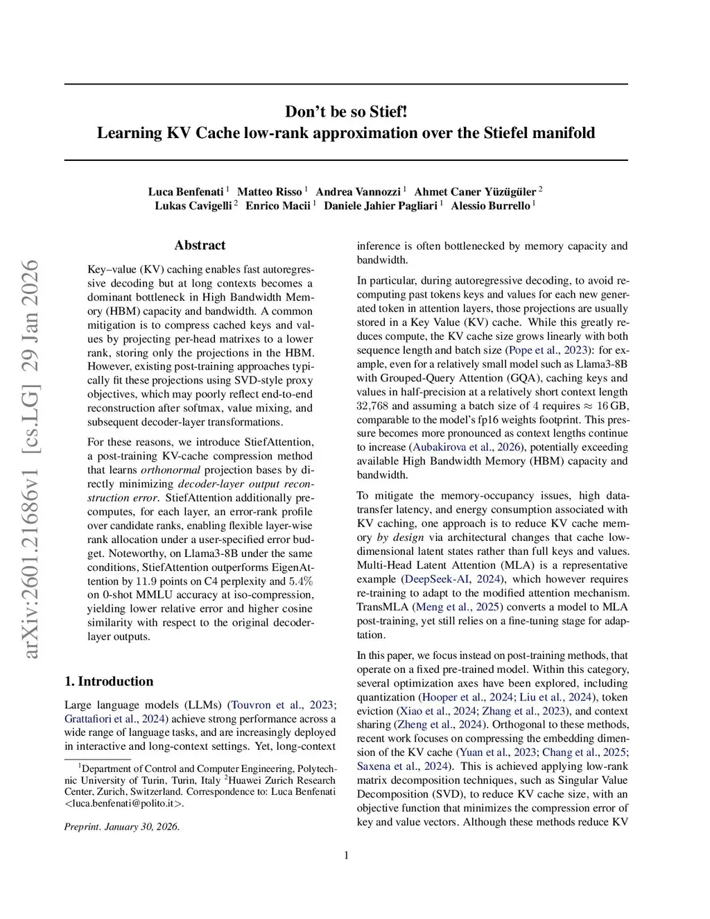 Don't be so Stief! Learning KV Cache low-rank approximation over the Stiefel manifold