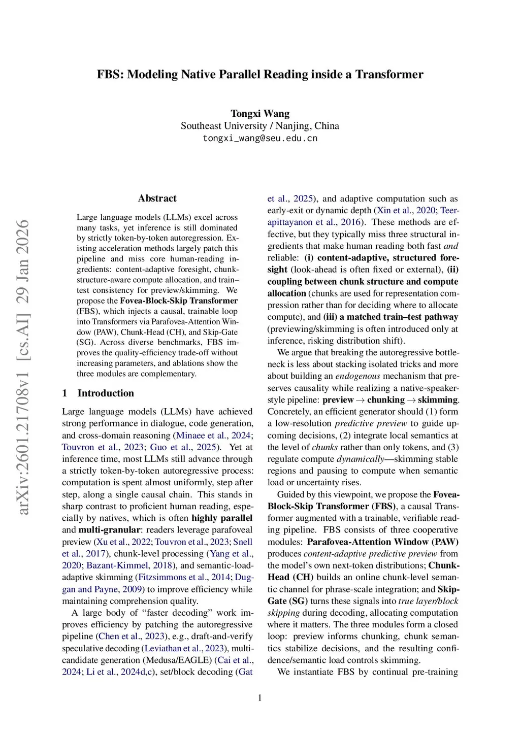 Large language models (LLMs) excel across many tasks, yet inference is still dominated by strictly token-by-token autoregression. Existing acceleration methods largely patch this pipeline and miss core human-reading ingredients: content-adaptive foresight, chunk-structure-aware compute allocation, and train--test consistency for preview/skimming. We propose the \textbf{Fovea-Block-Skip Transformer} (FBS), which injects a causal, trainable loop into Transformers via Parafovea-Attention Window (PAW), Chunk-Head (CH), and Skip-Gate (SG). Across diverse benchmarks, FBS improves the quality-efficiency trade-off without increasing parameters, and ablations show the three modules are complementary.