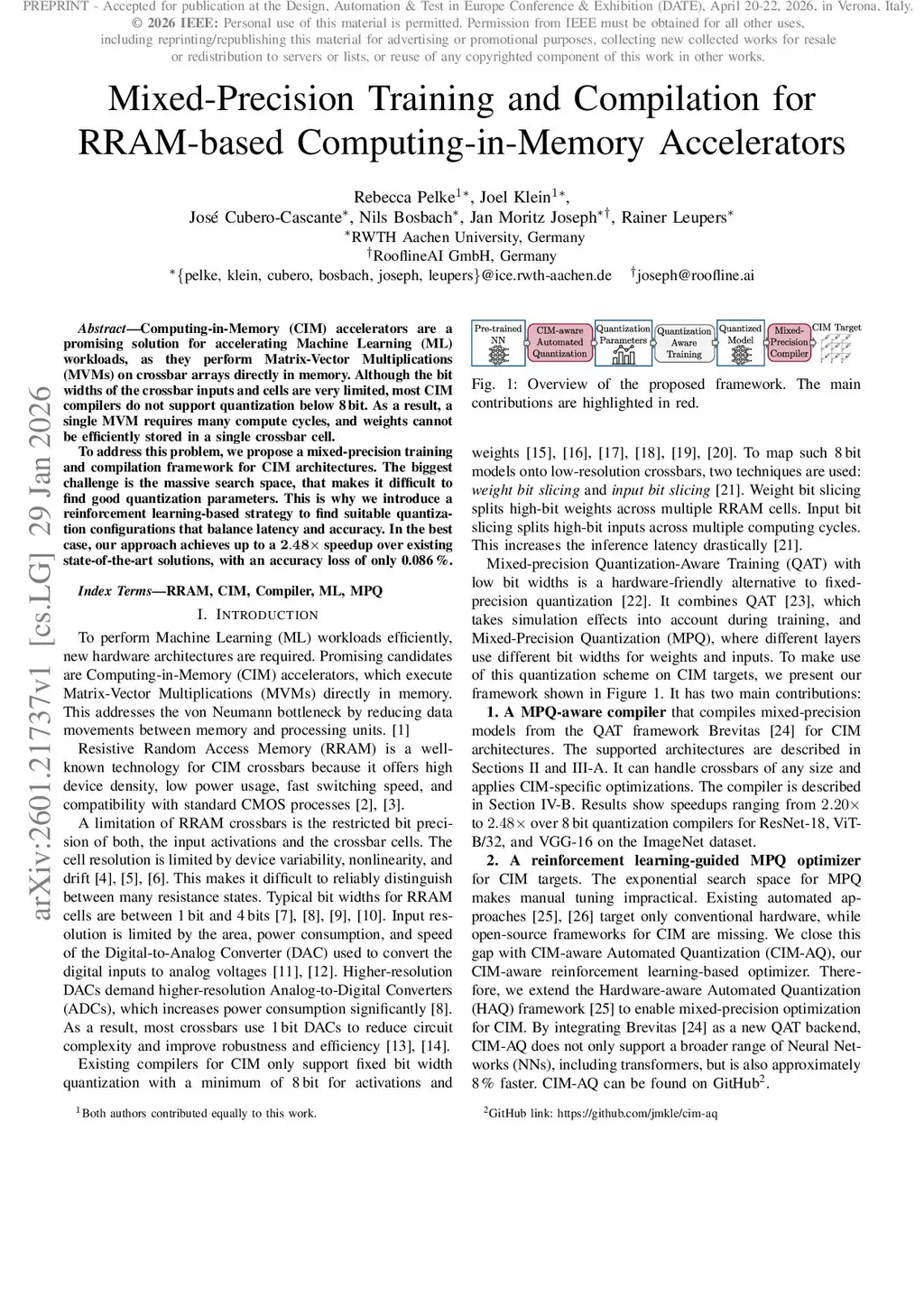Computing-in-Memory (CIM) accelerators are a promising solution for accelerating Machine Learning (ML) workloads, as they perform Matrix-Vector Multiplications (MVMs) on crossbar arrays directly in memory. Although the bit widths of the crossbar inputs and cells are very limited, most CIM compilers do not support quantization below 8 bit. As a result, a single MVM requires many compute cycles, and weights cannot be efficiently stored in a single crossbar cell. To address this problem, we propose a mixed-precision training and compilation framework for CIM architectures. The biggest challenge is the massive search space, that makes it difficult to find good quantization parameters. This is why we introduce a reinforcement learning-based strategy to find suitable quantization configurations that balance latency and accuracy. In the best case, our approach achieves up to a 2.48x speedup over existing state-of-the-art solutions, with an accuracy loss of only 0.086 %.