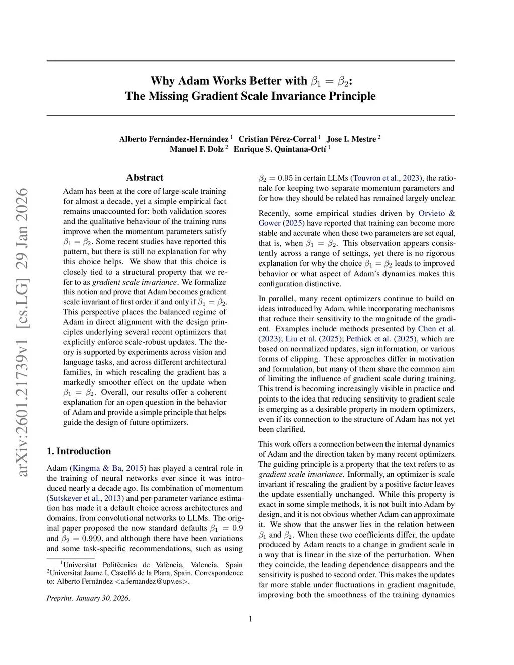Adam has been at the core of large-scale training for almost a decade, yet a simple empirical fact remains unaccounted for: both validation scores and the qualitative behaviour of the training runs improve when the momentum parameters satisfy . Some recent studies have reported this pattern, but there is still no explanation for why this choice helps. We show that this choice is closely tied to a structural property that we refer to as \textit{gradient scale invariance}. We formalize this notion and prove that Adam becomes gradient scale invariant of first order if and only if . This perspective places the balanced regime of Adam in direct alignment with the design principles underlying several recent optimizers that explicitly enforce scale-robust updates. The theory is supported by experiments across vision and language tasks, and across different architectural families, in which rescaling the gradient has a markedly smoother effect on the update when . Overall, our results offer a coherent explanation for an open question in the behavior of Adam and provide a simple principle that helps guide the design of future optimizers.