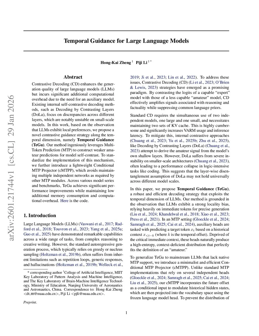 Contrastive Decoding (CD) enhances the generation quality of large language models (LLMs) but incurs significant additional computational overhead due to the need for an auxiliary model. Existing internal self-contrastive decoding methods, such as Decoding by Contrasting Layers (DoLa), focus on discrepancies across different layers, which are notably unstable on small-scale models. In this work, based on the observation that LLMs exhibit local preferences, we propose a novel contrastive guidance strategy along the temporal dimension, namely Temporal Guidance (TeGu). Our method ingeniously leverages Multi-Token Prediction (MTP) to construct weaker amateur predictions for model self-contrast. To standardize the implementation of this mechanism, we further introduce a lightweight Conditional MTP Projector (cMTPP), which avoids maintaining multiple independent networks as required by other MTP modules. Across various model series and benchmarks, TeGu achieves significant performance improvements while maintaining low additional memory consumption and computational overhead.