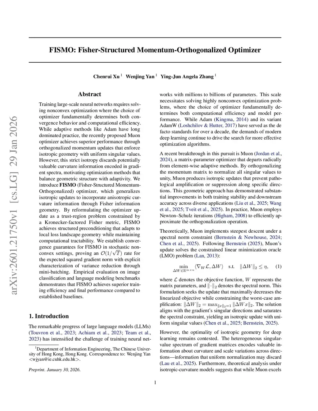 Training large-scale neural networks requires solving nonconvex optimization where the choice of optimizer fundamentally determines both convergence behavior and computational efficiency. While adaptive methods like Adam have long dominated practice, the recently proposed Muon optimizer achieves superior performance through orthogonalized momentum updates that enforce isotropic geometry with uniform singular values. However, this strict isotropy discards potentially valuable curvature information encoded in gradient spectra, motivating optimization methods that balance geometric structure with adaptivity. We introduce FISMO (Fisher-Structured Momentum-Orthogonalized) optimizer, which generalizes isotropic updates to incorporate anisotropic curvature information through Fisher information geometry. By reformulating the optimizer update as a trust-region problem constrained by a Kronecker-factored Fisher metric, FISMO achieves structured preconditioning that adapts to local loss landscape geometry while maintaining computational tractability. We establish convergence guarantees for FISMO in stochastic nonconvex settings, proving an rate for the expected squared gradient norm with explicit characterization of variance reduction through mini-batching. Empirical evaluation on image classification and language modeling benchmarks demonstrates that FISMO achieves superior training efficiency and final performance compared to established baselines.