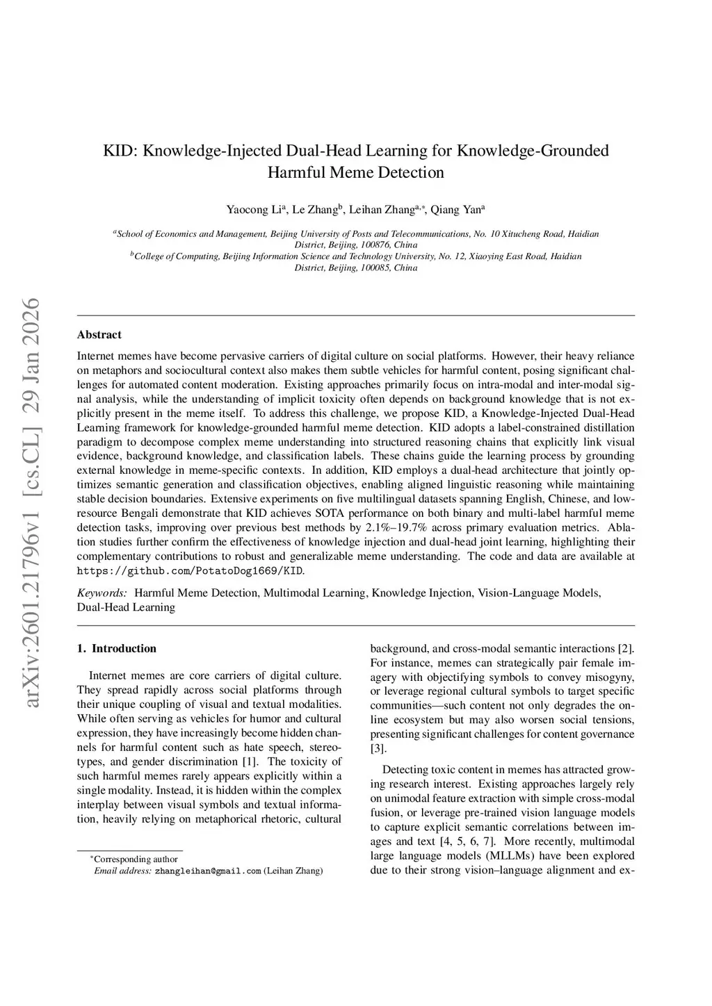 KID: Knowledge-Injected Dual-Head Learning for Knowledge-Grounded Harmful Meme Detection