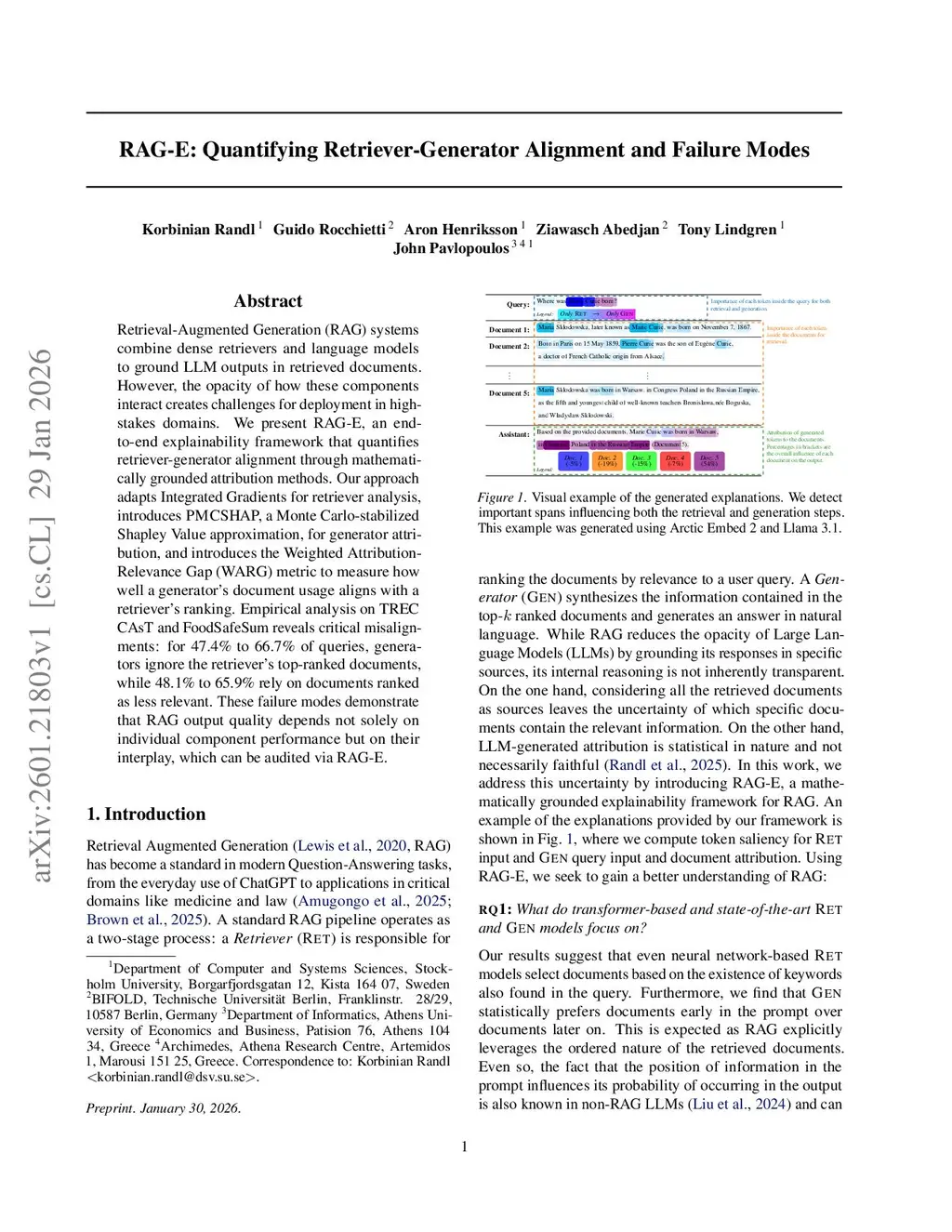 Retrieval-Augmented Generation (RAG) systems combine dense retrievers and language models to ground LLM outputs in retrieved documents. However, the opacity of how these components interact creates challenges for deployment in high-stakes domains. We present RAG-E, an end-to-end explainability framework that quantifies retriever-generator alignment through mathematically grounded attribution methods. Our approach adapts Integrated Gradients for retriever analysis, introduces PMCSHAP, a Monte Carlo-stabilized Shapley Value approximation, for generator attribution, and introduces the Weighted Attribution-Relevance Gap (WARG) metric to measure how well a generator's document usage aligns with a retriever's ranking. Empirical analysis on TREC CAsT and FoodSafeSum reveals critical misalignments: for 47.4% to 66.7% of queries, generators ignore the retriever's top-ranked documents, while 48.1% to 65.9% rely on documents ranked as less relevant. These failure modes demonstrate that RAG output quality depends not solely on individual component performance but on their interplay, which can be audited via RAG-E.