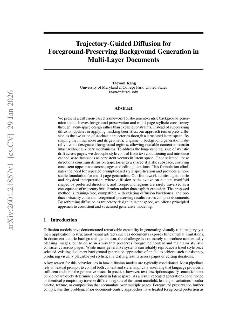 We present a diffusion-based framework for document-centric background generation that achieves foreground preservation and multi-page stylistic consistency through latent-space design rather than explicit constraints. Instead of suppressing diffusion updates or applying masking heuristics, our approach reinterprets diffusion as the evolution of stochastic trajectories through a structured latent space. By shaping the initial noise and its geometric alignment, background generation naturally avoids designated foreground regions, allowing readable content to remain intact without auxiliary mechanisms. To address the long-standing issue of stylistic drift across pages, we decouple style control from text conditioning and introduce cached style directions as persistent vectors in latent space. Once selected, these directions constrain diffusion trajectories to a shared stylistic subspace, ensuring consistent appearance across pages and editing iterations. This formulation eliminates the need for repeated prompt-based style specification and provides a more stable foundation for multi-page generation. Our framework admits a geometric and physical interpretation, where diffusion paths evolve on a latent manifold shaped by preferred directions, and foreground regions are rarely traversed as a consequence of trajectory initialization rather than explicit exclusion. The proposed method is training-free, compatible with existing diffusion backbones, and produces visually coherent, foreground-preserving results across complex documents. By reframing diffusion as trajectory design in latent space, we offer a principled approach to consistent and structured generative modeling.