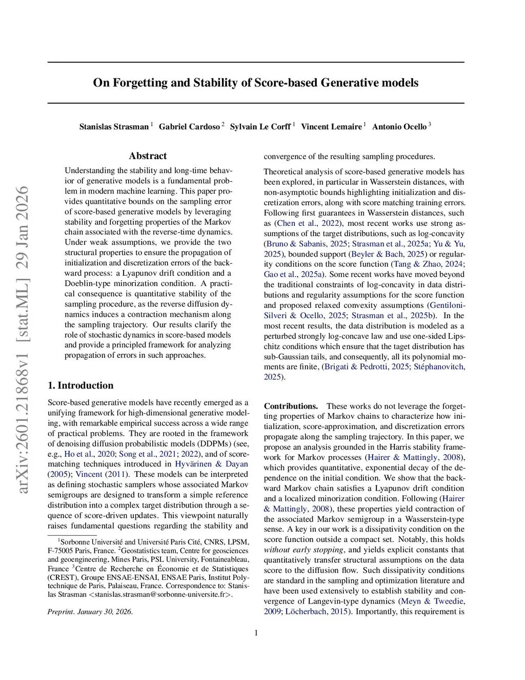 Understanding the stability and long-time behavior of generative models is a fundamental problem in modern machine learning. This paper provides quantitative bounds on the sampling error of score-based generative models by leveraging stability and forgetting properties of the Markov chain associated with the reverse-time dynamics. Under weak assumptions, we provide the two structural properties to ensure the propagation of initialization and discretization errors of the backward process: a Lyapunov drift condition and a Doeblin-type minorization condition. A practical consequence is quantitative stability of the sampling procedure, as the reverse diffusion dynamics induces a contraction mechanism along the sampling trajectory. Our results clarify the role of stochastic dynamics in score-based models and provide a principled framework for analyzing propagation of errors in such approaches.