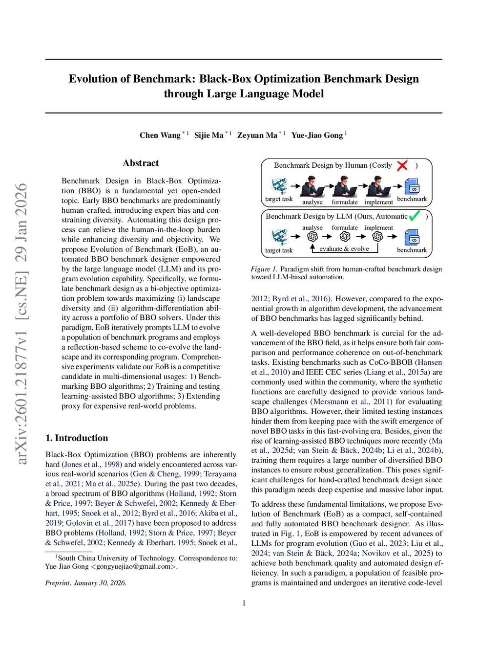 Benchmark Design in Black-Box Optimization (BBO) is a fundamental yet open-ended topic. Early BBO benchmarks are predominantly human-crafted, introducing expert bias and constraining diversity. Automating this design process can relieve the human-in-the-loop burden while enhancing diversity and objectivity. We propose Evolution of Benchmark (EoB), an automated BBO benchmark designer empowered by the large language model (LLM) and its program evolution capability. Specifically, we formulate benchmark design as a bi-objective optimization problem towards maximizing (i) landscape diversity and (ii) algorithm-differentiation ability across a portfolio of BBO solvers. Under this paradigm, EoB iteratively prompts LLM to evolve a population of benchmark programs and employs a reflection-based scheme to co-evolve the landscape and its corresponding program. Comprehensive experiments validate our EoB is a competitive candidate in multi-dimensional usages: 1) Benchmarking BBO algorithms; 2) Training and testing learning-assisted BBO algorithms; 3) Extending proxy for expensive real-world problems.