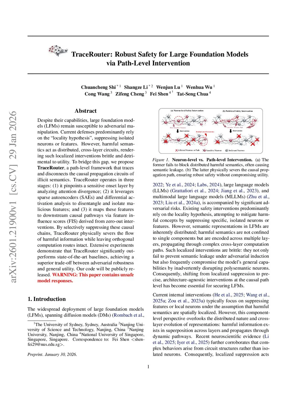 Despite their capabilities, large foundation models (LFMs) remain susceptible to adversarial manipulation. Current defenses predominantly rely on the "locality hypothesis", suppressing isolated neurons or features. However, harmful semantics act as distributed, cross-layer circuits, rendering such localized interventions brittle and detrimental to utility. To bridge this gap, we propose \textbf{TraceRouter}, a path-level framework that traces and disconnects the causal propagation circuits of illicit semantics. TraceRouter operates in three stages: (1) it pinpoints a sensitive onset layer by analyzing attention divergence; (2) it leverages sparse autoencoders (SAEs) and differential activation analysis to disentangle and isolate malicious features; and (3) it maps these features to downstream causal pathways via feature influence scores (FIS) derived from zero-out interventions. By selectively suppressing these causal chains, TraceRouter physically severs the flow of harmful information while leaving orthogonal computation routes intact. Extensive experiments demonstrate that TraceRouter significantly outperforms state-of-the-art baselines, achieving a superior trade-off between adversarial robustness and general utility. Our code will be publicly released. WARNING: This paper contains unsafe model responses.