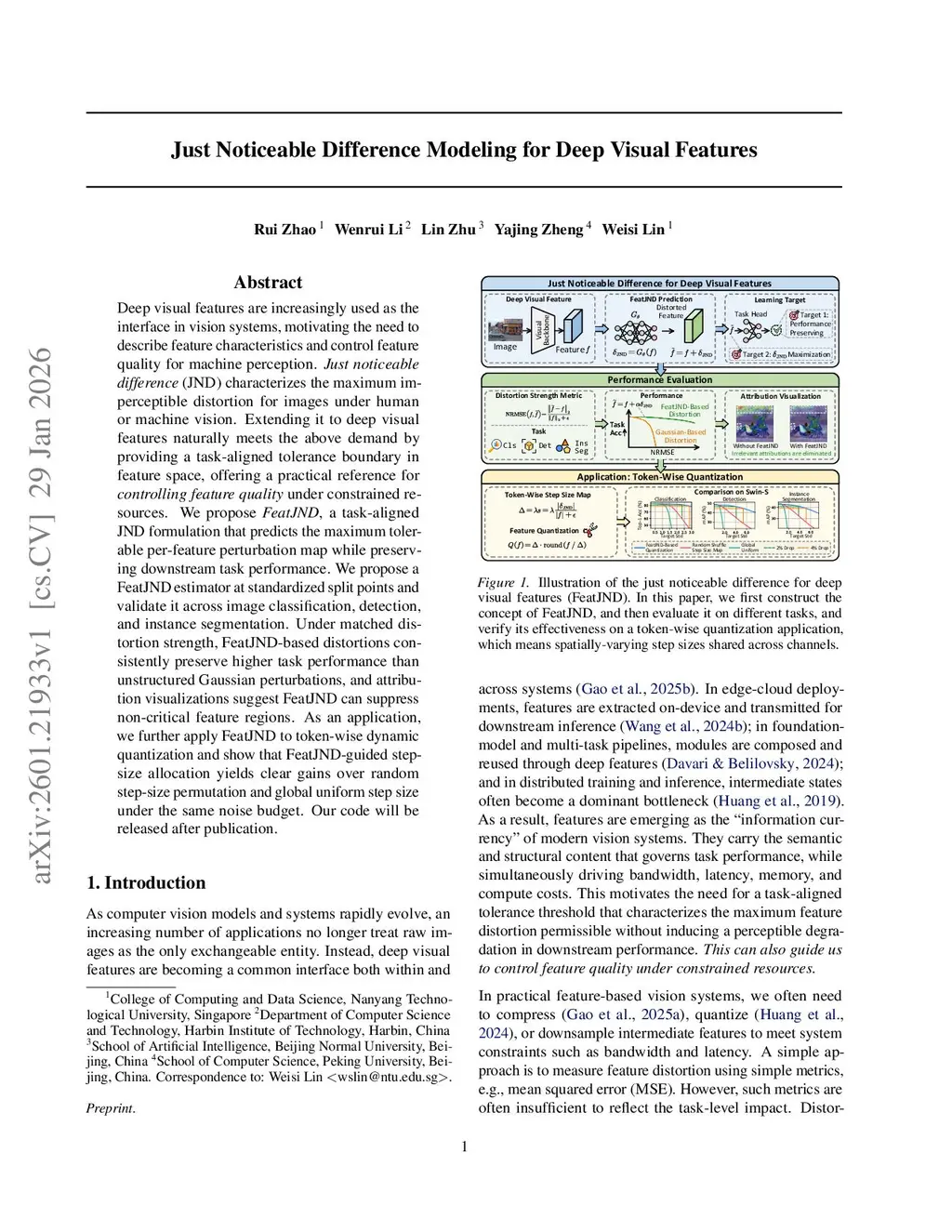 Deep visual features are increasingly used as the interface in vision systems, motivating the need to describe feature characteristics and control feature quality for machine perception. Just noticeable difference (JND) characterizes the maximum imperceptible distortion for images under human or machine vision. Extending it to deep visual features naturally meets the above demand by providing a task-aligned tolerance boundary in feature space, offering a practical reference for controlling feature quality under constrained resources. We propose FeatJND, a task-aligned JND formulation that predicts the maximum tolerable per-feature perturbation map while preserving downstream task performance. We propose a FeatJND estimator at standardized split points and validate it across image classification, detection, and instance segmentation. Under matched distortion strength, FeatJND-based distortions consistently preserve higher task performance than unstructured Gaussian perturbations, and attribution visualizations suggest FeatJND can suppress non-critical feature regions. As an application, we further apply FeatJND to token-wise dynamic quantization and show that FeatJND-guided step-size allocation yields clear gains over random step-size permutation and global uniform step size under the same noise budget. Our code will be released after publication.