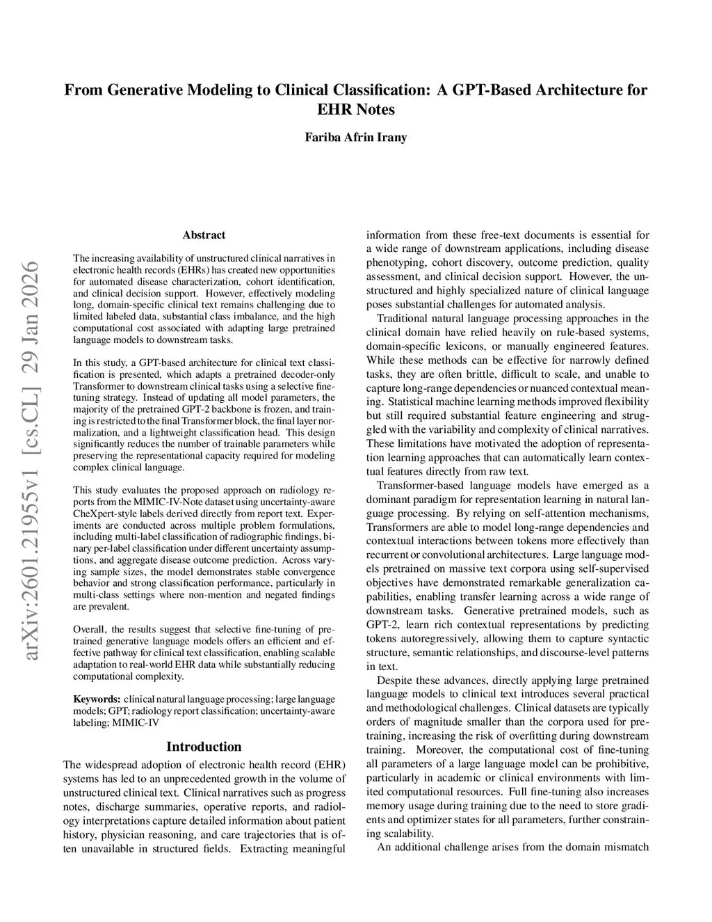The increasing availability of unstructured clinical narratives in electronic health records (EHRs) has created new opportunities for automated disease characterization, cohort identification, and clinical decision support. However, modeling long, domain-specific clinical text remains challenging due to limited labeled data, severe class imbalance, and the high computational cost of adapting large pretrained language models.This study presents a GPT-based architecture for clinical text classification that adapts a pretrained decoder-only Transformer using a selective fine-tuning strategy. Rather than updating all model parameters, the majority of the GPT-2 backbone is frozen, and training is restricted to the final Transformer block, the final layer normalization, and a lightweight classification head. This approach substantially reduces the number of trainable parameters while preserving the representational capacity required to model complex clinical language.The proposed method is evaluated on radiology reports from the MIMIC-IV-Note dataset using uncertainty-aware CheXpert-style labels derived directly from report text. Experiments cover multiple problem formulations, including multi-label classification of radiographic findings, binary per-label classification under different uncertainty assumptions, and aggregate disease outcome prediction. Across varying dataset sizes, the model exhibits stable convergence behavior and strong classification performance, particularly in settings dominated by non-mention and negated findings.Overall, the results indicate that selective fine-tuning of pretrained generative language models provides an efficient and effective pathway for clinical text classification, enabling scalable adaptation to real-world EHR data while significantly reducing computational complexity.