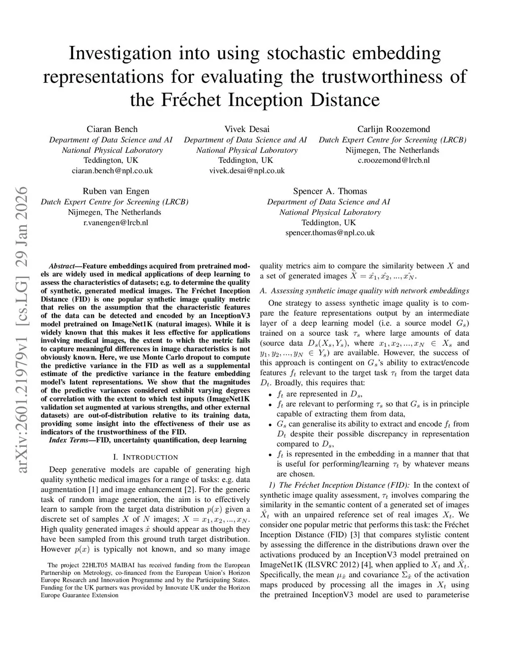 Feature embeddings acquired from pretrained models are widely used in medical applications of deep learning to assess the characteristics of datasets; e.g. to determine the quality of synthetic, generated medical images. The Fréchet Inception Distance (FID) is one popular synthetic image quality metric that relies on the assumption that the characteristic features of the data can be detected and encoded by an InceptionV3 model pretrained on ImageNet1K (natural images). While it is widely known that this makes it less effective for applications involving medical images, the extent to which the metric fails to capture meaningful differences in image characteristics is not obviously known. Here, we use Monte Carlo dropout to compute the predictive variance in the FID as well as a supplemental estimate of the predictive variance in the feature embedding model's latent representations. We show that the magnitudes of the predictive variances considered exhibit varying degrees of correlation with the extent to which test inputs (ImageNet1K validation set augmented at various strengths, and other external datasets) are out-of-distribution relative to its training data, providing some insight into the effectiveness of their use as indicators of the trustworthiness of the FID.