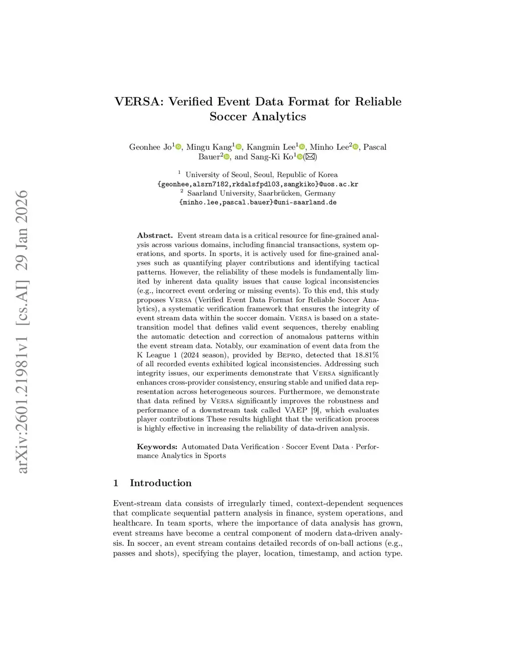 Event stream data is a critical resource for fine-grained analysis across various domains, including financial transactions, system operations, and sports. In sports, it is actively used for fine-grained analyses such as quantifying player contributions and identifying tactical patterns. However, the reliability of these models is fundamentally limited by inherent data quality issues that cause logical inconsistencies (e.g., incorrect event ordering or missing events). To this end, this study proposes VERSA (Verified Event Data Format for Reliable Soccer Analytics), a systematic verification framework that ensures the integrity of event stream data within the soccer domain. VERSA is based on a state-transition model that defines valid event sequences, thereby enabling the automatic detection and correction of anomalous patterns within the event stream data. Notably, our examination of event data from the K League 1 (2024 season), provided by Bepro, detected that 18.81% of all recorded events exhibited logical inconsistencies. Addressing such integrity issues, our experiments demonstrate that VERSA significantly enhances cross-provider consistency, ensuring stable and unified data representation across heterogeneous sources. Furthermore, we demonstrate that data refined by VERSA significantly improves the robustness and performance of a downstream task called VAEP, which evaluates player contributions. These results highlight that the verification process is highly effective in increasing the reliability of data-driven analysis.