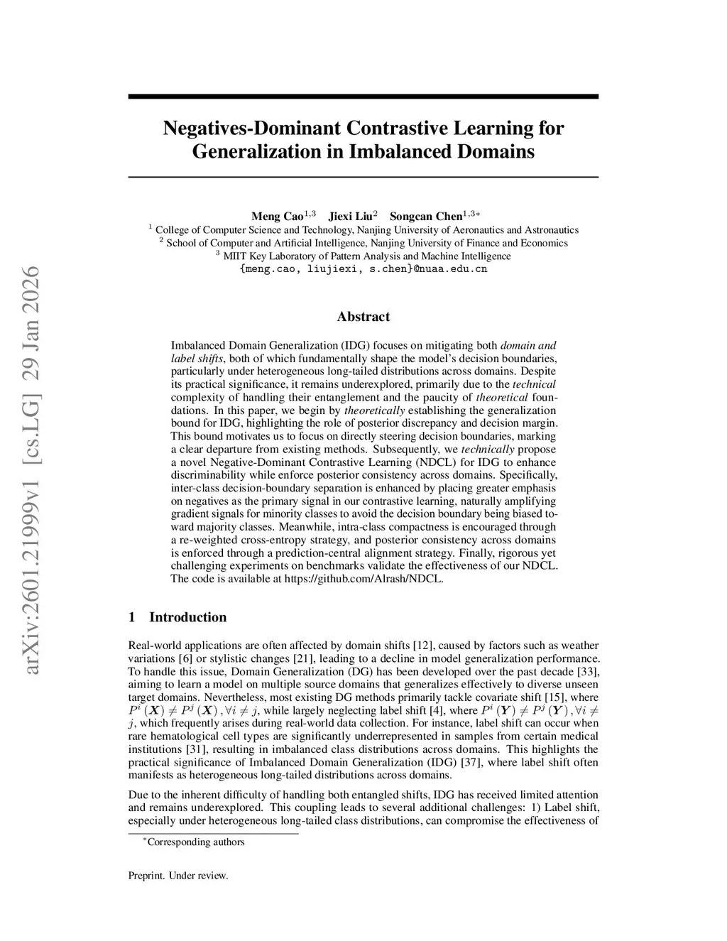 Imbalanced Domain Generalization (IDG) focuses on mitigating both domain and label shifts, both of which fundamentally shape the model's decision boundaries, particularly under heterogeneous long-tailed distributions across domains. Despite its practical significance, it remains underexplored, primarily due to the technical complexity of handling their entanglement and the paucity of theoretical foundations. In this paper, we begin by theoretically establishing the generalization bound for IDG, highlighting the role of posterior discrepancy and decision margin. This bound motivates us to focus on directly steering decision boundaries, marking a clear departure from existing methods. Subsequently, we technically propose a novel Negative-Dominant Contrastive Learning (NDCL) for IDG to enhance discriminability while enforce posterior consistency across domains. Specifically, inter-class decision-boundary separation is enhanced by placing greater emphasis on negatives as the primary signal in our contrastive learning, naturally amplifying gradient signals for minority classes to avoid the decision boundary being biased toward majority classes. Meanwhile, intra-class compactness is encouraged through a re-weighted cross-entropy strategy, and posterior consistency across domains is enforced through a prediction-central alignment strategy. Finally, rigorous yet challenging experiments on benchmarks validate the effectiveness of our NDCL. The code is available atthis https URL.