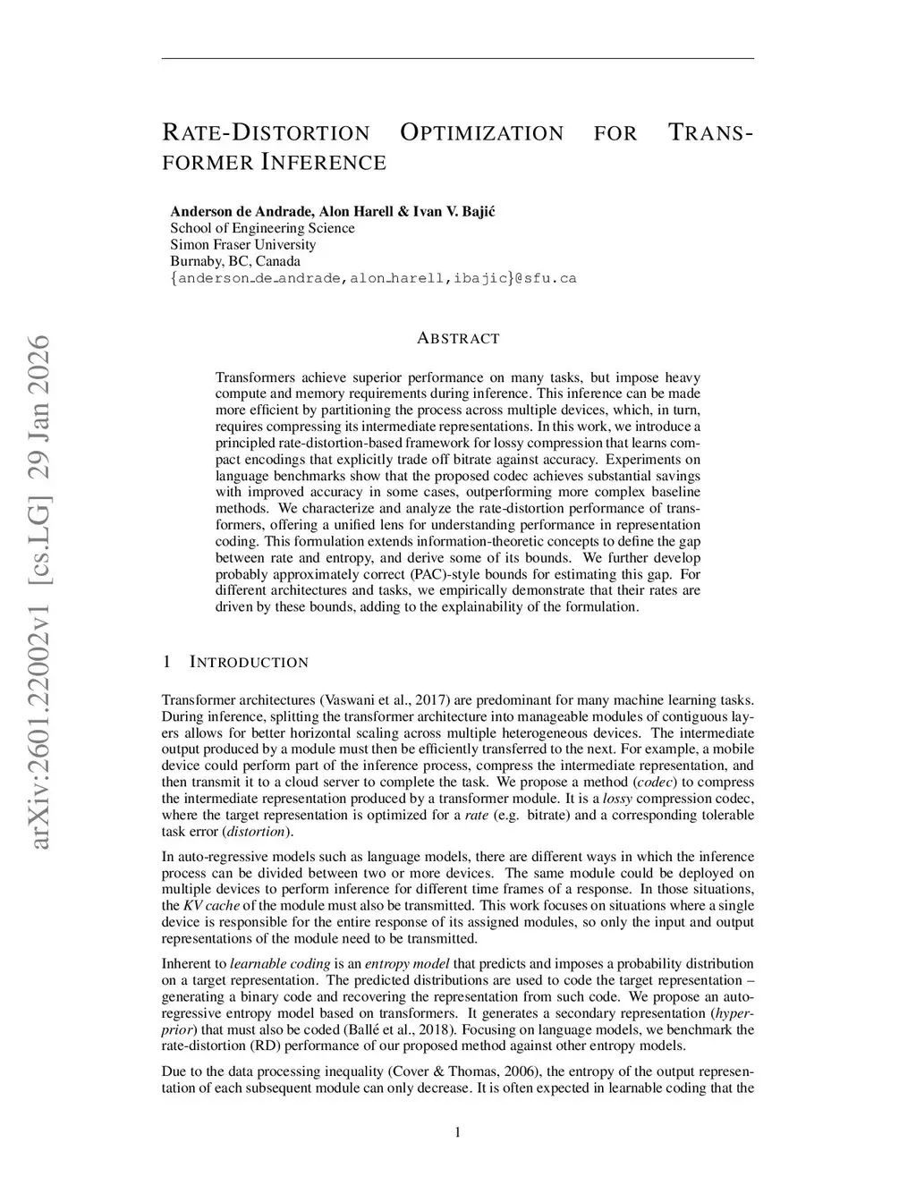 Transformers achieve superior performance on many tasks, but impose heavy compute and memory requirements during inference. This inference can be made more efficient by partitioning the process across multiple devices, which, in turn, requires compressing its intermediate representations. In this work, we introduce a principled rate-distortion-based framework for lossy compression that learns compact encodings that explicitly trade off bitrate against accuracy. Experiments on language benchmarks show that the proposed codec achieves substantial savings with improved accuracy in some cases, outperforming more complex baseline methods. We characterize and analyze the rate-distortion performance of transformers, offering a unified lens for understanding performance in representation coding. This formulation extends information-theoretic concepts to define the gap between rate and entropy, and derive some of its bounds. We further develop probably approximately correct (PAC)-style bounds for estimating this gap. For different architectures and tasks, we empirically demonstrate that their rates are driven by these bounds, adding to the explainability of the formulation.