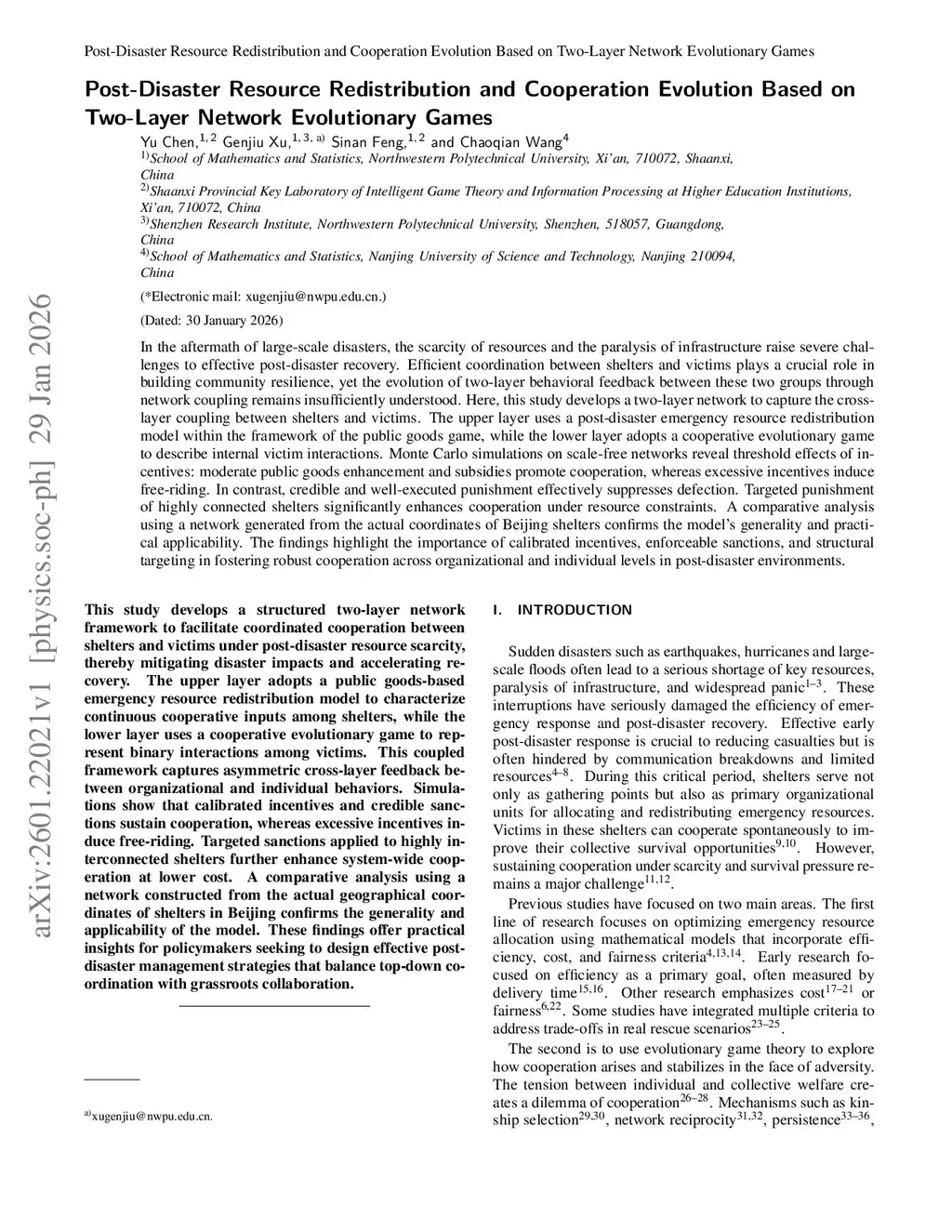 Post-Disaster Resource Redistribution and Cooperation Evolution Based on Two-Layer Network Evolutionary Games