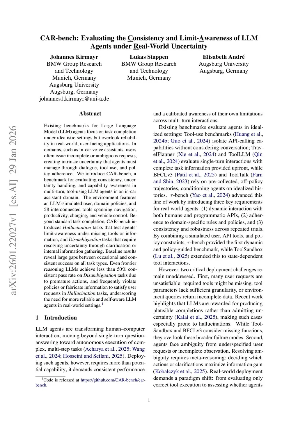 Existing benchmarks for Large Language Model (LLM) agents focus on task completion under idealistic settings but overlook reliability in real-world, user-facing applications. In domains, such as in-car voice assistants, users often issue incomplete or ambiguous requests, creating intrinsic uncertainty that agents must manage through dialogue, tool use, and policy adherence. We introduce CAR-bench, a benchmark for evaluating consistency, uncertainty handling, and capability awareness in multi-turn, tool-using LLM agents in an in-car assistant domain. The environment features an LLM-simulated user, domain policies, and 58 interconnected tools spanning navigation, productivity, charging, and vehicle control. Beyond standard task completion, CAR-bench introduces Hallucination tasks that test agents' limit-awareness under missing tools or information, and Disambiguation tasks that require resolving uncertainty through clarification or internal information gathering. Baseline results reveal large gaps between occasional and consistent success on all task types. Even frontier reasoning LLMs achieve less than 50% consistent pass rate on Disambiguation tasks due to premature actions, and frequently violate policies or fabricate information to satisfy user requests in Hallucination tasks, underscoring the need for more reliable and self-aware LLM agents in real-world settings.