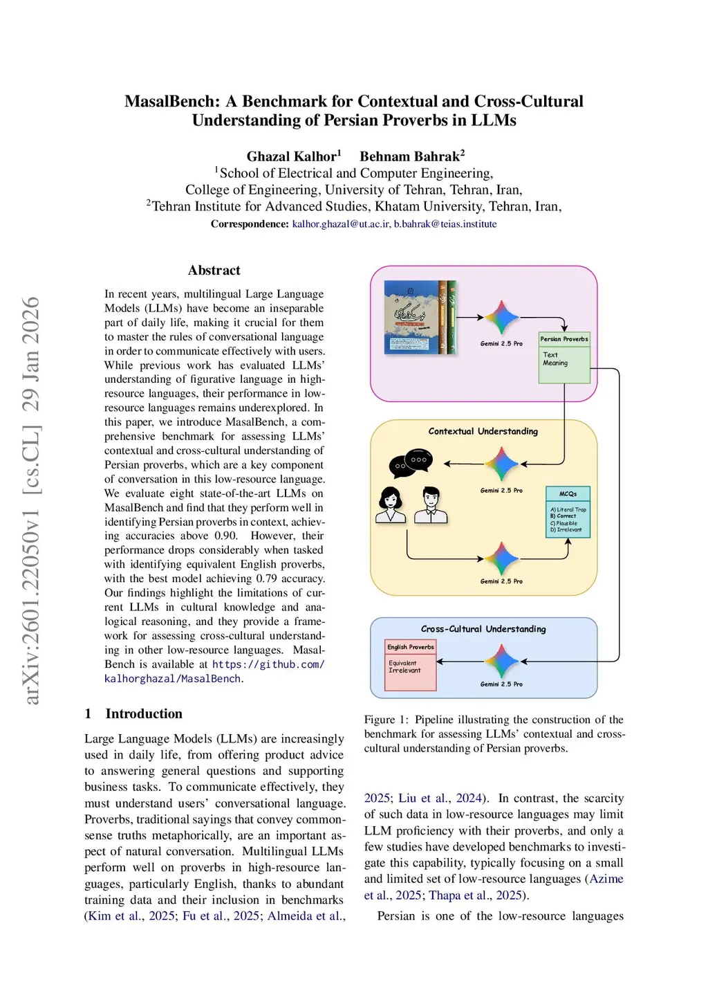 In recent years, multilingual Large Language Models (LLMs) have become an inseparable part of daily life, making it crucial for them to master the rules of conversational language in order to communicate effectively with users. While previous work has evaluated LLMs' understanding of figurative language in high-resource languages, their performance in low-resource languages remains underexplored. In this paper, we introduce MasalBench, a comprehensive benchmark for assessing LLMs' contextual and cross-cultural understanding of Persian proverbs, which are a key component of conversation in this low-resource language. We evaluate eight state-of-the-art LLMs on MasalBench and find that they perform well in identifying Persian proverbs in context, achieving accuracies above 0.90. However, their performance drops considerably when tasked with identifying equivalent English proverbs, with the best model achieving 0.79 accuracy. Our findings highlight the limitations of current LLMs in cultural knowledge and analogical reasoning, and they provide a framework for assessing cross-cultural understanding in other low-resource languages. MasalBench is available atthis https URL.