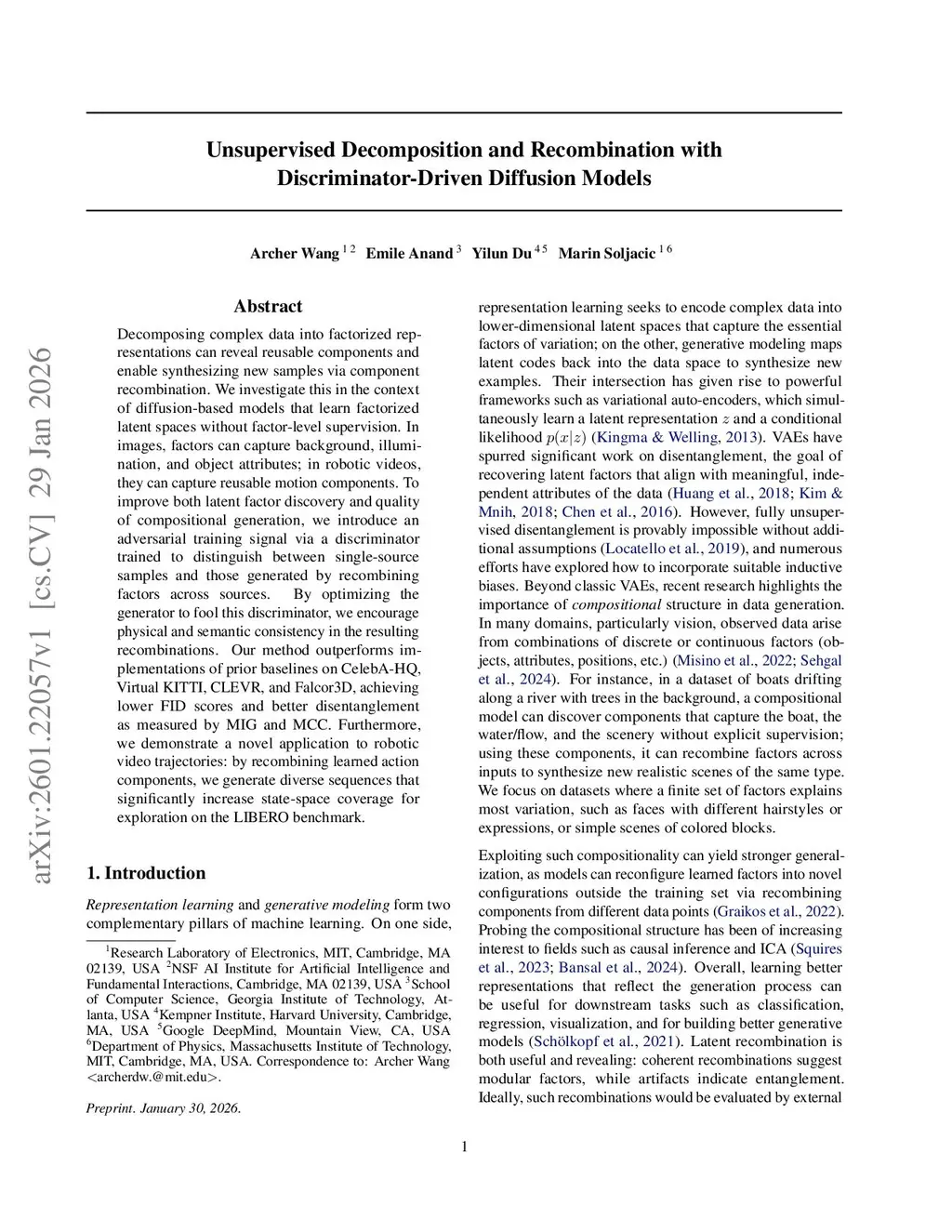 Decomposing complex data into factorized representations can reveal reusable components and enable synthesizing new samples via component recombination. We investigate this in the context of diffusion-based models that learn factorized latent spaces without factor-level supervision. In images, factors can capture background, illumination, and object attributes; in robotic videos, they can capture reusable motion components. To improve both latent factor discovery and quality of compositional generation, we introduce an adversarial training signal via a discriminator trained to distinguish between single-source samples and those generated by recombining factors across sources. By optimizing the generator to fool this discriminator, we encourage physical and semantic consistency in the resulting recombinations. Our method outperforms implementations of prior baselines on CelebA-HQ, Virtual KITTI, CLEVR, and Falcor3D, achieving lower FID scores and better disentanglement as measured by MIG and MCC. Furthermore, we demonstrate a novel application to robotic video trajectories: by recombining learned action components, we generate diverse sequences that significantly increase state-space coverage for exploration on the LIBERO benchmark.
