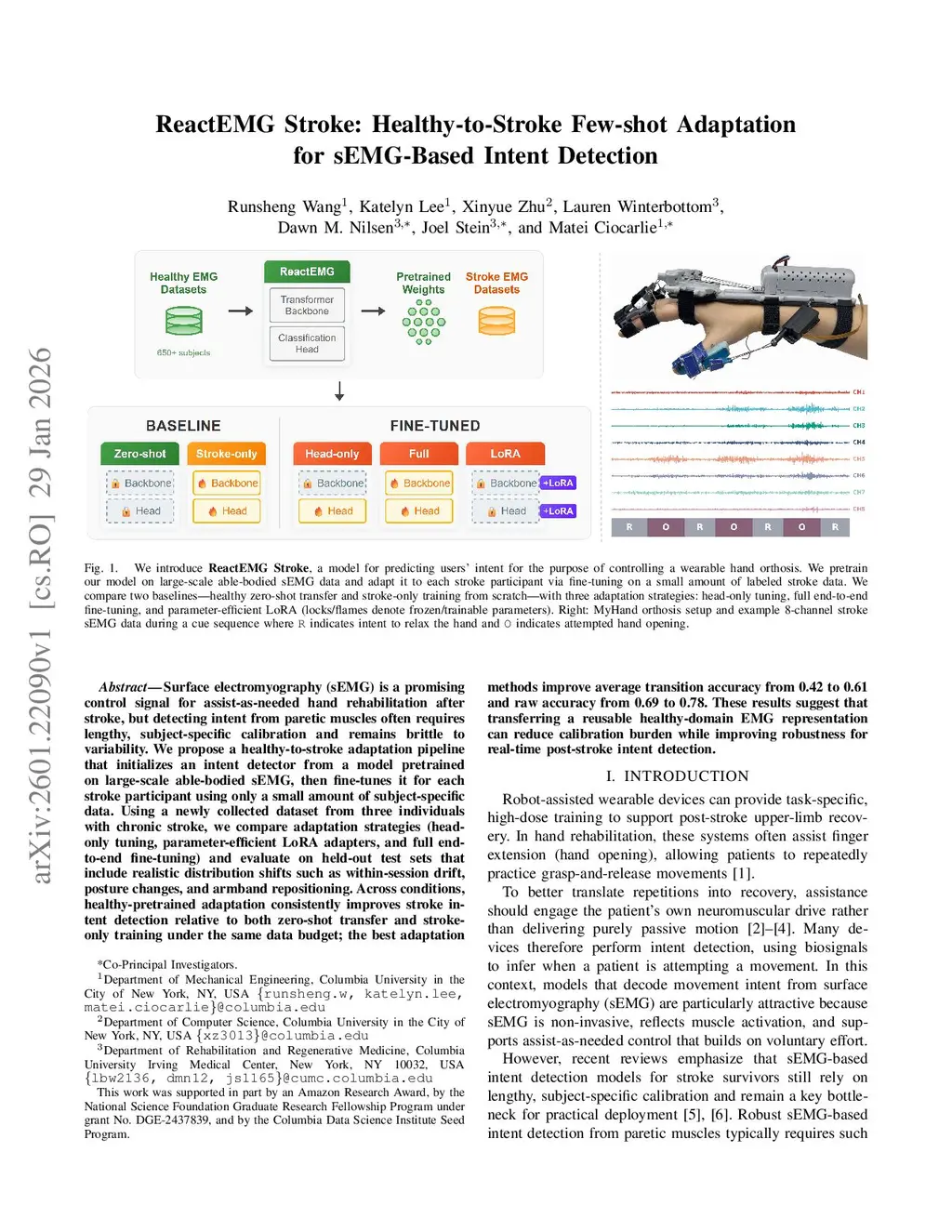 Surface electromyography (sEMG) is a promising control signal for assist-as-needed hand rehabilitation after stroke, but detecting intent from paretic muscles often requires lengthy, subject-specific calibration and remains brittle to variability. We propose a healthy-to-stroke adaptation pipeline that initializes an intent detector from a model pretrained on large-scale able-bodied sEMG, then fine-tunes it for each stroke participant using only a small amount of subject-specific data. Using a newly collected dataset from three individuals with chronic stroke, we compare adaptation strategies (head-only tuning, parameter-efficient LoRA adapters, and full end-to-end fine-tuning) and evaluate on held-out test sets that include realistic distribution shifts such as within-session drift, posture changes, and armband repositioning. Across conditions, healthy-pretrained adaptation consistently improves stroke intent detection relative to both zero-shot transfer and stroke-only training under the same data budget; the best adaptation methods improve average transition accuracy from 0.42 to 0.61 and raw accuracy from 0.69 to 0.78. These results suggest that transferring a reusable healthy-domain EMG representation can reduce calibration burden while improving robustness for real-time post-stroke intent detection.