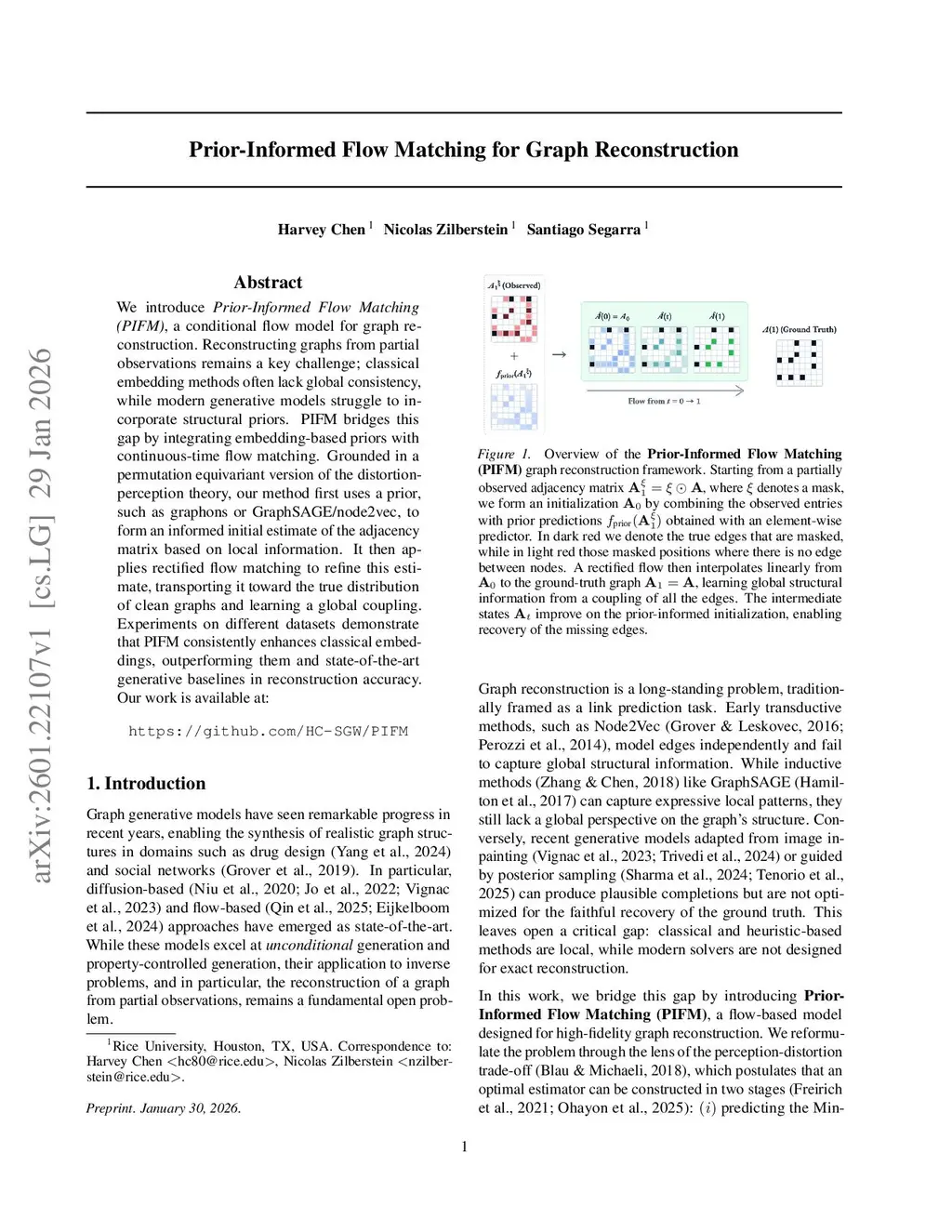 We introduce Prior-Informed Flow Matching (PIFM), a conditional flow model for graph reconstruction. Reconstructing graphs from partial observations remains a key challenge; classical embedding methods often lack global consistency, while modern generative models struggle to incorporate structural priors. PIFM bridges this gap by integrating embedding-based priors with continuous-time flow matching. Grounded in a permutation equivariant version of the distortion-perception theory, our method first uses a prior, such as graphons or GraphSAGE/node2vec, to form an informed initial estimate of the adjacency matrix based on local information. It then applies rectified flow matching to refine this estimate, transporting it toward the true distribution of clean graphs and learning a global coupling. Experiments on different datasets demonstrate that PIFM consistently enhances classical embeddings, outperforming them and state-of-the-art generative baselines in reconstruction accuracy.
