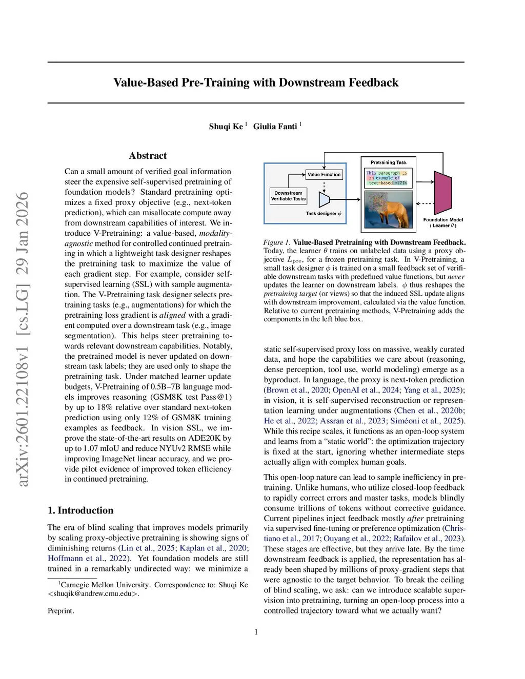 Can a small amount of verified goal information steer the expensive self-supervised pretraining of foundation models? Standard pretraining optimizes a fixed proxy objective (e.g., next-token prediction), which can misallocate compute away from downstream capabilities of interest. We introduce V-Pretraining: a value-based, modality-agnostic method for controlled continued pretraining in which a lightweight task designer reshapes the pretraining task to maximize the value of each gradient step. For example, consider self-supervised learning (SSL) with sample augmentation. The V-Pretraining task designer selects pretraining tasks (e.g., augmentations) for which the pretraining loss gradient is aligned with a gradient computed over a downstream task (e.g., image segmentation). This helps steer pretraining towards relevant downstream capabilities. Notably, the pretrained model is never updated on downstream task labels; they are used only to shape the pretraining task. Under matched learner update budgets, V-Pretraining of 0.5B--7B language models improves reasoning (GSM8K test Pass@1) by up to 18% relative over standard next-token prediction using only 12% of GSM8K training examples as feedback. In vision SSL, we improve the state-of-the-art results on ADE20K by up to 1.07 mIoU and reduce NYUv2 RMSE while improving ImageNet linear accuracy, and we provide pilot evidence of improved token efficiency in continued pretraining.