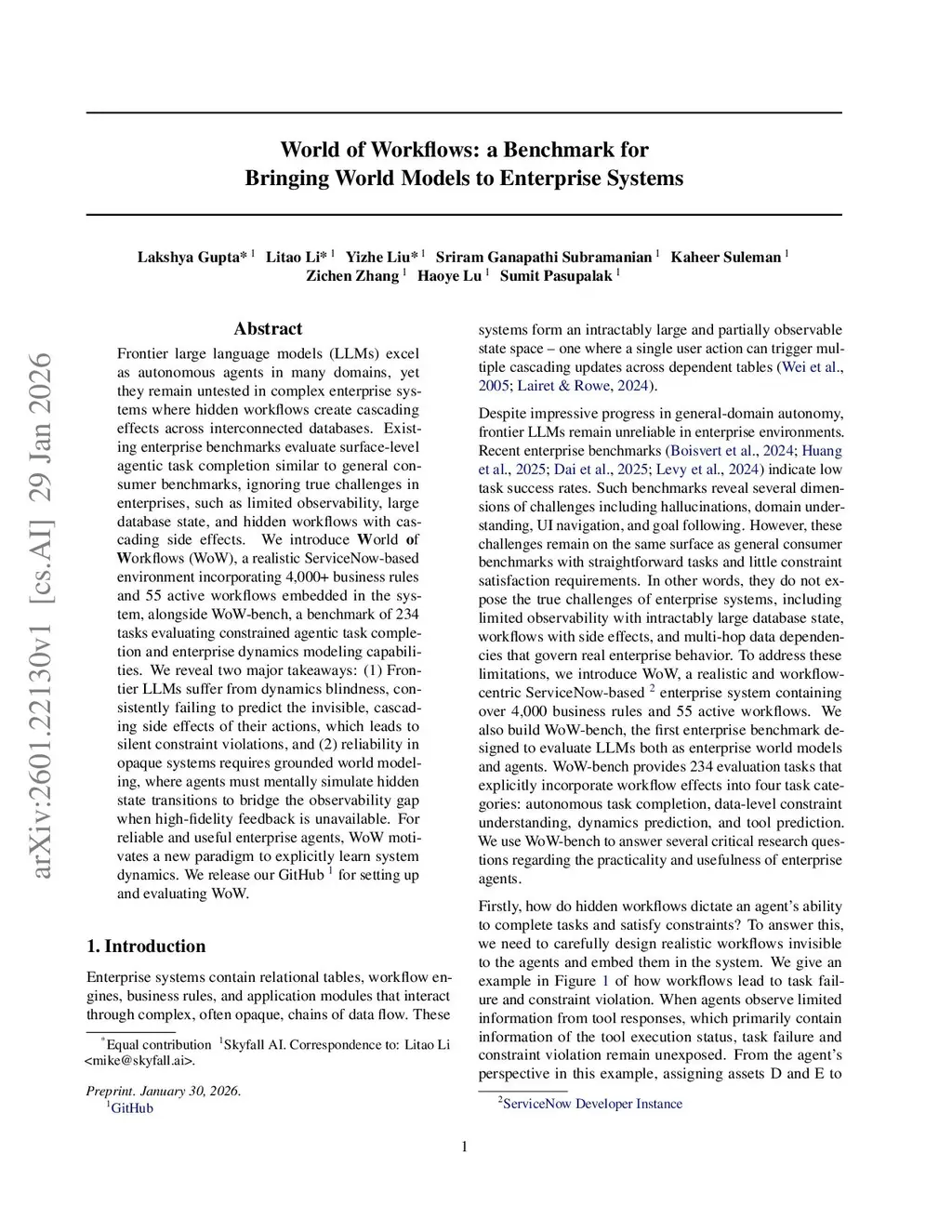 Frontier large language models (LLMs) excel as autonomous agents in many domains, yet they remain untested in complex enterprise systems where hidden workflows create cascading effects across interconnected databases. Existing enterprise benchmarks evaluate surface-level agentic task completion similar to general consumer benchmarks, ignoring true challenges in enterprises, such as limited observability, large database state, and hidden workflows with cascading side effects. We introduce World of Workflows (WoW), a realistic ServiceNow-based environment incorporating 4,000+ business rules and 55 active workflows embedded in the system, alongside WoW-bench, a benchmark of 234 tasks evaluating constrained agentic task completion and enterprise dynamics modeling capabilities. We reveal two major takeaways: (1) Frontier LLMs suffer from dynamics blindness, consistently failing to predict the invisible, cascading side effects of their actions, which leads to silent constraint violations, and (2) reliability in opaque systems requires grounded world modeling, where agents must mentally simulate hidden state transitions to bridge the observability gap when high-fidelity feedback is unavailable. For reliable and useful enterprise agents, WoW motivates a new paradigm to explicitly learn system dynamics. We release our GitHub for setting up and evaluating WoW.