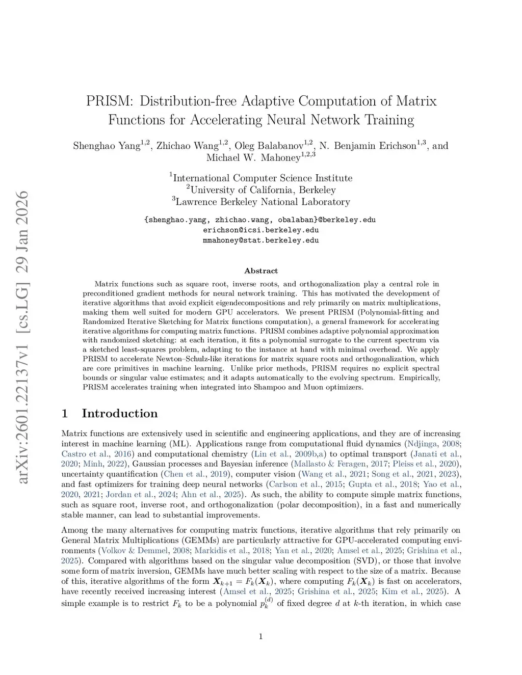 PRISM: Distribution-free Adaptive Computation of Matrix Functions for Accelerating Neural Network Training