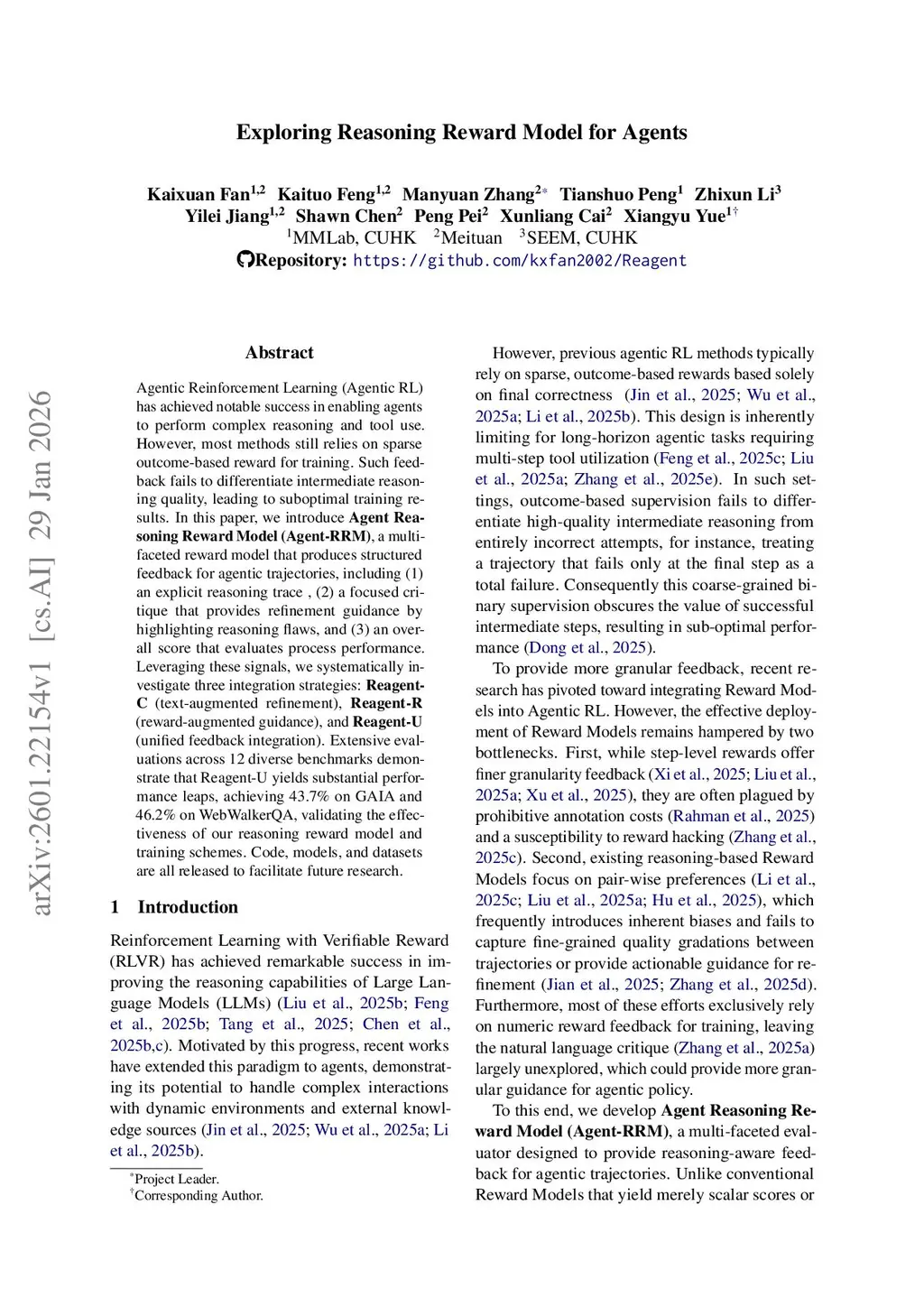 Agentic Reinforcement Learning (Agentic RL) has achieved notable success in enabling agents to perform complex reasoning and tool use. However, most methods still relies on sparse outcome-based reward for training. Such feedback fails to differentiate intermediate reasoning quality, leading to suboptimal training results. In this paper, we introduce Agent Reasoning Reward Model (Agent-RRM), a multi-faceted reward model that produces structured feedback for agentic trajectories, including (1) an explicit reasoning trace , (2) a focused critique that provides refinement guidance by highlighting reasoning flaws, and (3) an overall score that evaluates process performance. Leveraging these signals, we systematically investigate three integration strategies: Reagent-C (text-augmented refinement), Reagent-R (reward-augmented guidance), and Reagent-U (unified feedback integration). Extensive evaluations across 12 diverse benchmarks demonstrate that Reagent-U yields substantial performance leaps, achieving 43.7% on GAIA and 46.2% on WebWalkerQA, validating the effectiveness of our reasoning reward model and training schemes. Code, models, and datasets are all released to facilitate future research.