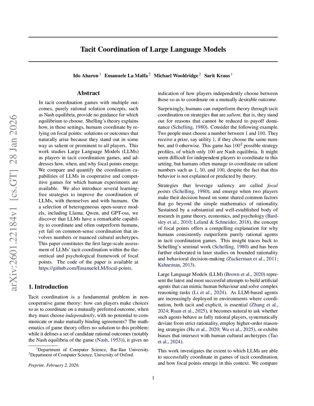 In tacit coordination games with multiple outcomes, purely rational solution concepts, such as Nash equilibria, provide no guidance for which equilibrium to choose. Shelling's theory explains how, in these settings, humans coordinate by relying on focal points: solutions or outcomes that naturally arise because they stand out in some way as salient or prominent to all players. This work studies Large Language Models (LLMs) as players in tacit coordination games, and addresses how, when, and why focal points emerge. We compare and quantify the coordination capabilities of LLMs in cooperative and competitive games for which human experiments are available. We also introduce several learning-free strategies to improve the coordination of LLMs, with themselves and with humans. On a selection of heterogeneous open-source models, including Llama, Qwen, and GPT-oss, we discover that LLMs have a remarkable capability to coordinate and often outperform humans, yet fail on common-sense coordination that involves numbers or nuanced cultural archetypes. This paper constitutes the first large-scale assessment of LLMs' tacit coordination within the theoretical and psychological framework of focal points.