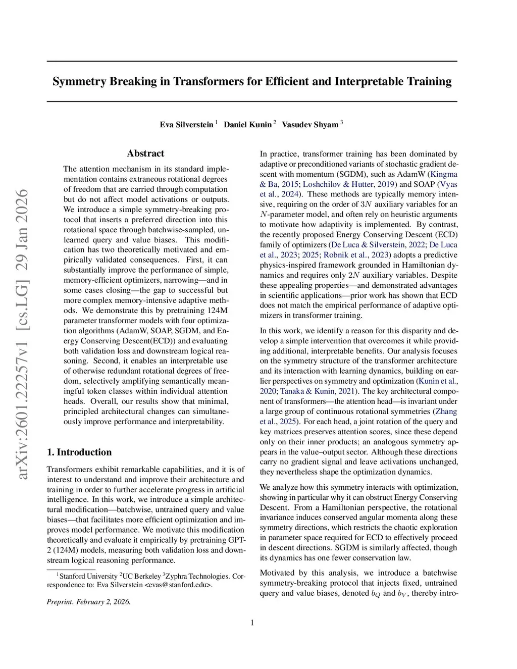 The attention mechanism in its standard implementation contains extraneous rotational degrees of freedom that are carried through computation but do not affect model activations or outputs. We introduce a simple symmetry-breaking protocol that inserts a preferred direction into this rotational space through batchwise-sampled, unlearned query and value biases. This modification has two theoretically motivated and empirically validated consequences. First, it can substantially improve the performance of simple, memory-efficient optimizers, narrowing -- and in some cases closing -- the gap to successful but more complex memory-intensive adaptive methods. We demonstrate this by pretraining 124M parameter transformer models with four optimization algorithms (AdamW, SOAP, SGDM, and Energy Conserving Descent(ECD)) and evaluating both validation loss and downstream logical reasoning. Second, it enables an interpretable use of otherwise redundant rotational degrees of freedom, selectively amplifying semantically meaningful token classes within individual attention heads. Overall, our results show that minimal, principled architectural changes can simultaneously improve performance and interpretability.