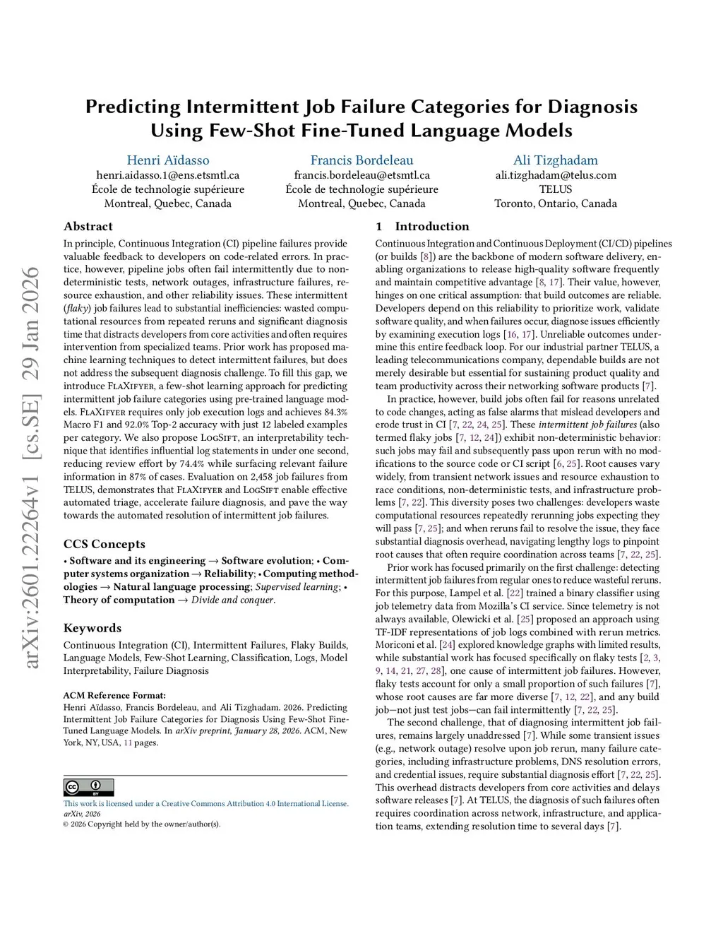 In principle, Continuous Integration (CI) pipeline failures provide valuable feedback to developers on code-related errors. In practice, however, pipeline jobs often fail intermittently due to non-deterministic tests, network outages, infrastructure failures, resource exhaustion, and other reliability issues. These intermittent (flaky) job failures lead to substantial inefficiencies: wasted computational resources from repeated reruns and significant diagnosis time that distracts developers from core activities and often requires intervention from specialized teams. Prior work has proposed machine learning techniques to detect intermittent failures, but does not address the subsequent diagnosis challenge. To fill this gap, we introduce FlaXifyer, a few-shot learning approach for predicting intermittent job failure categories using pre-trained language models. FlaXifyer requires only job execution logs and achieves 84.3% Macro F1 and 92.0% Top-2 accuracy with just 12 labeled examples per category. We also propose LogSift, an interpretability technique that identifies influential log statements in under one second, reducing review effort by 74.4% while surfacing relevant failure information in 87% of cases. Evaluation on 2,458 job failures from TELUS demonstrates that FlaXifyer and LogSift enable effective automated triage, accelerate failure diagnosis, and pave the way towards the automated resolution of intermittent job failures.