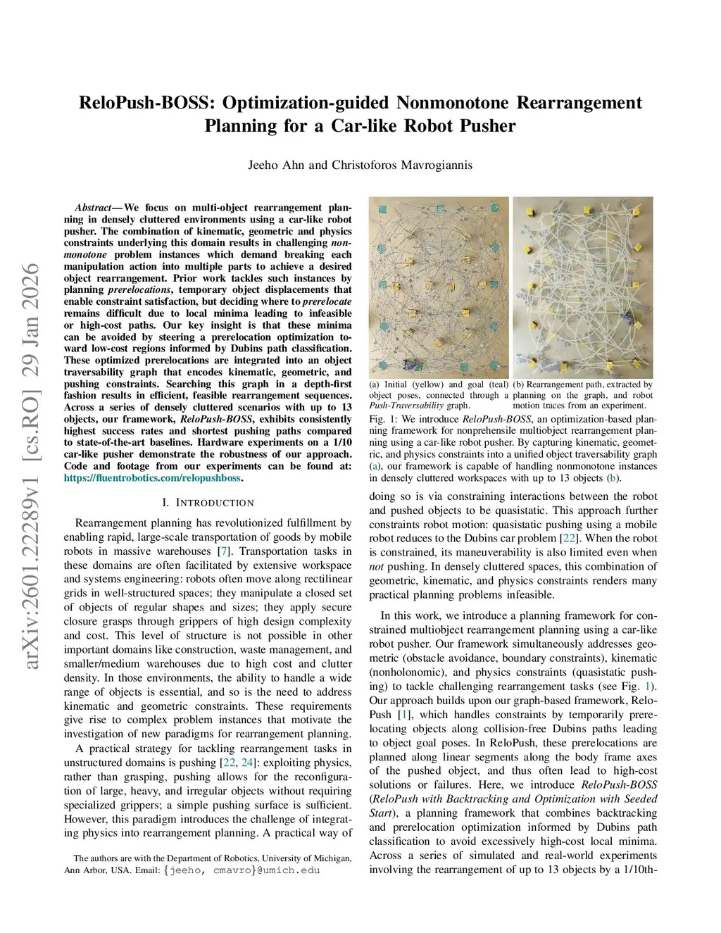 We focus on multi-object rearrangement planning in densely cluttered environments using a car-like robot pusher. The combination of kinematic, geometric and physics constraints underlying this domain results in challenging nonmonotone problem instances which demand breaking each manipulation action into multiple parts to achieve a desired object rearrangement. Prior work tackles such instances by planning prerelocations, temporary object displacements that enable constraint satisfaction, but deciding where to prerelocate remains difficult due to local minima leading to infeasible or high-cost paths. Our key insight is that these minima can be avoided by steering a prerelocation optimization toward low-cost regions informed by Dubins path classification. These optimized prerelocations are integrated into an object traversability graph that encodes kinematic, geometric, and pushing constraints. Searching this graph in a depth-first fashion results in efficient, feasible rearrangement sequences. Across a series of densely cluttered scenarios with up to 13 objects, our framework, ReloPush-BOSS, exhibits consistently highest success rates and shortest pushing paths compared to state-of-the-art baselines. Hardware experiments on a 1/10 car-like pusher demonstrate the robustness of our approach. Code and footage from our experiments can be found at:this https URL.