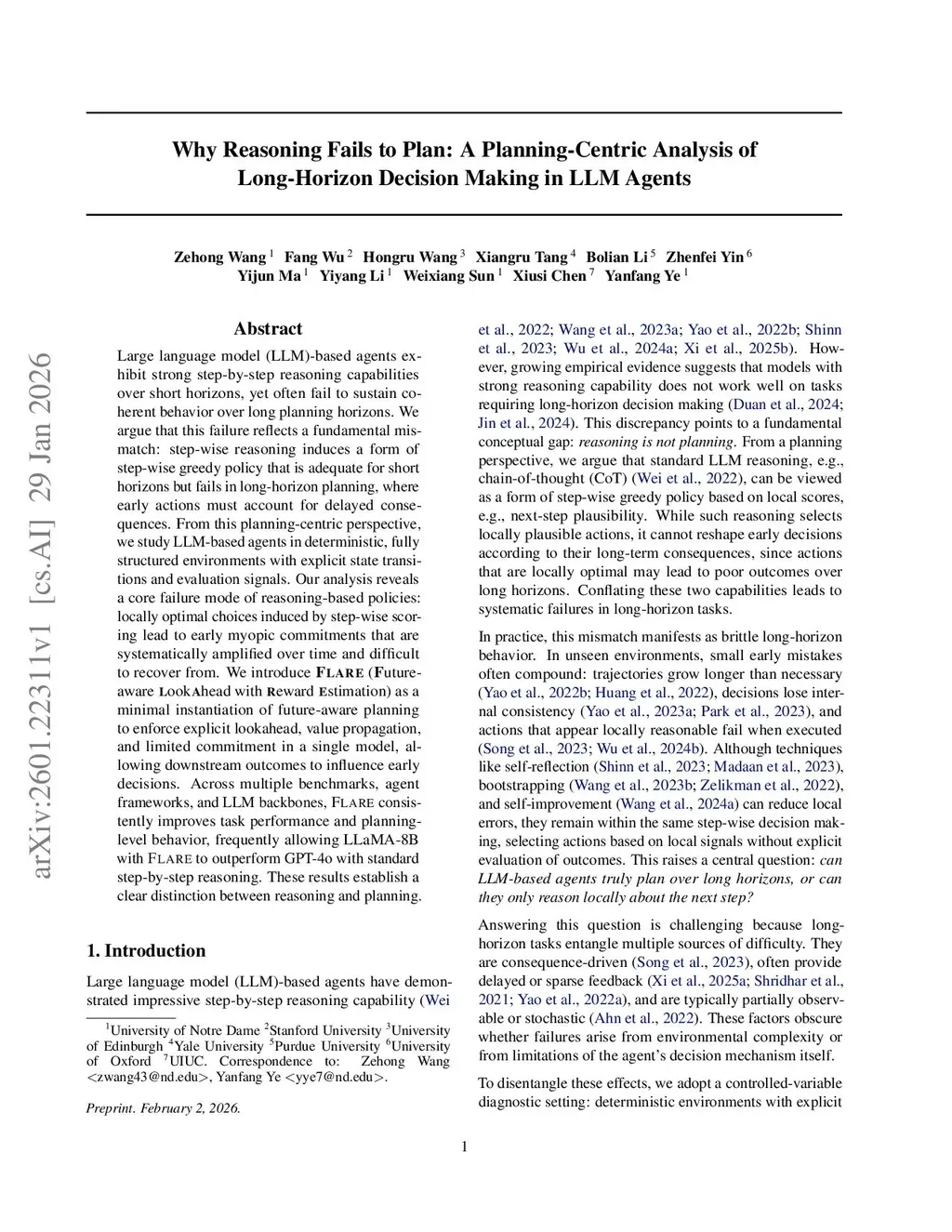 Large language model (LLM)-based agents exhibit strong step-by-step reasoning capabilities over short horizons, yet often fail to sustain coherent behavior over long planning horizons. We argue that this failure reflects a fundamental mismatch: step-wise reasoning induces a form of step-wise greedy policy that is adequate for short horizons but fails in long-horizon planning, where early actions must account for delayed consequences. From this planning-centric perspective, we study LLM-based agents in deterministic, fully structured environments with explicit state transitions and evaluation signals. Our analysis reveals a core failure mode of reasoning-based policies: locally optimal choices induced by step-wise scoring lead to early myopic commitments that are systematically amplified over time and difficult to recover from. We introduce FLARE (Future-aware Lookahead with Reward Estimation) as a minimal instantiation of future-aware planning to enforce explicit lookahead, value propagation, and limited commitment in a single model, allowing downstream outcomes to influence early decisions. Across multiple benchmarks, agent frameworks, and LLM backbones, FLARE consistently improves task performance and planning-level behavior, frequently allowing LLaMA-8B with FLARE to outperform GPT-4o with standard step-by-step reasoning. These results establish a clear distinction between reasoning and planning.