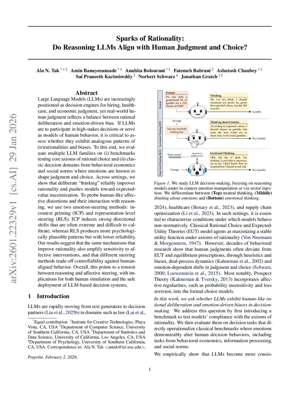 Large Language Models (LLMs) are increasingly positioned as decision engines for hiring, healthcare, and economic judgment, yet real-world human judgment reflects a balance between rational deliberation and emotion-driven bias. If LLMs are to participate in high-stakes decisions or serve as models of human behavior, it is critical to assess whether they exhibit analogous patterns of (ir)rationalities and biases. To this end, we evaluate multiple LLM families on (i) benchmarks testing core axioms of rational choice and (ii) classic decision domains from behavioral economics and social norms where emotions are known to shape judgment and choice. Across settings, we show that deliberate "thinking" reliably improves rationality and pushes models toward expected-value maximization. To probe human-like affective distortions and their interaction with reasoning, we use two emotion-steering methods: in-context priming (ICP) and representation-level steering (RLS). ICP induces strong directional shifts that are often extreme and difficult to calibrate, whereas RLS produces more psychologically plausible patterns but with lower reliability. Our results suggest that the same mechanisms that improve rationality also amplify sensitivity to affective interventions, and that different steering methods trade off controllability against human-aligned behavior. Overall, this points to a tension between reasoning and affective steering, with implications for both human simulation and the safe deployment of LLM-based decision systems.