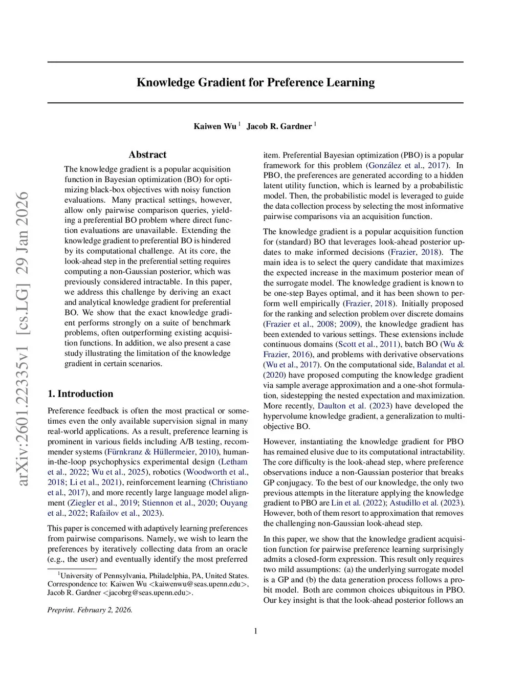 The knowledge gradient is a popular acquisition function in Bayesian optimization (BO) for optimizing black-box objectives with noisy function evaluations. Many practical settings, however, allow only pairwise comparison queries, yielding a preferential BO problem where direct function evaluations are unavailable. Extending the knowledge gradient to preferential BO is hindered by its computational challenge. At its core, the look-ahead step in the preferential setting requires computing a non-Gaussian posterior, which was previously considered intractable. In this paper, we address this challenge by deriving an exact and analytical knowledge gradient for preferential BO. We show that the exact knowledge gradient performs strongly on a suite of benchmark problems, often outperforming existing acquisition functions. In addition, we also present a case study illustrating the limitation of the knowledge gradient in certain scenarios.