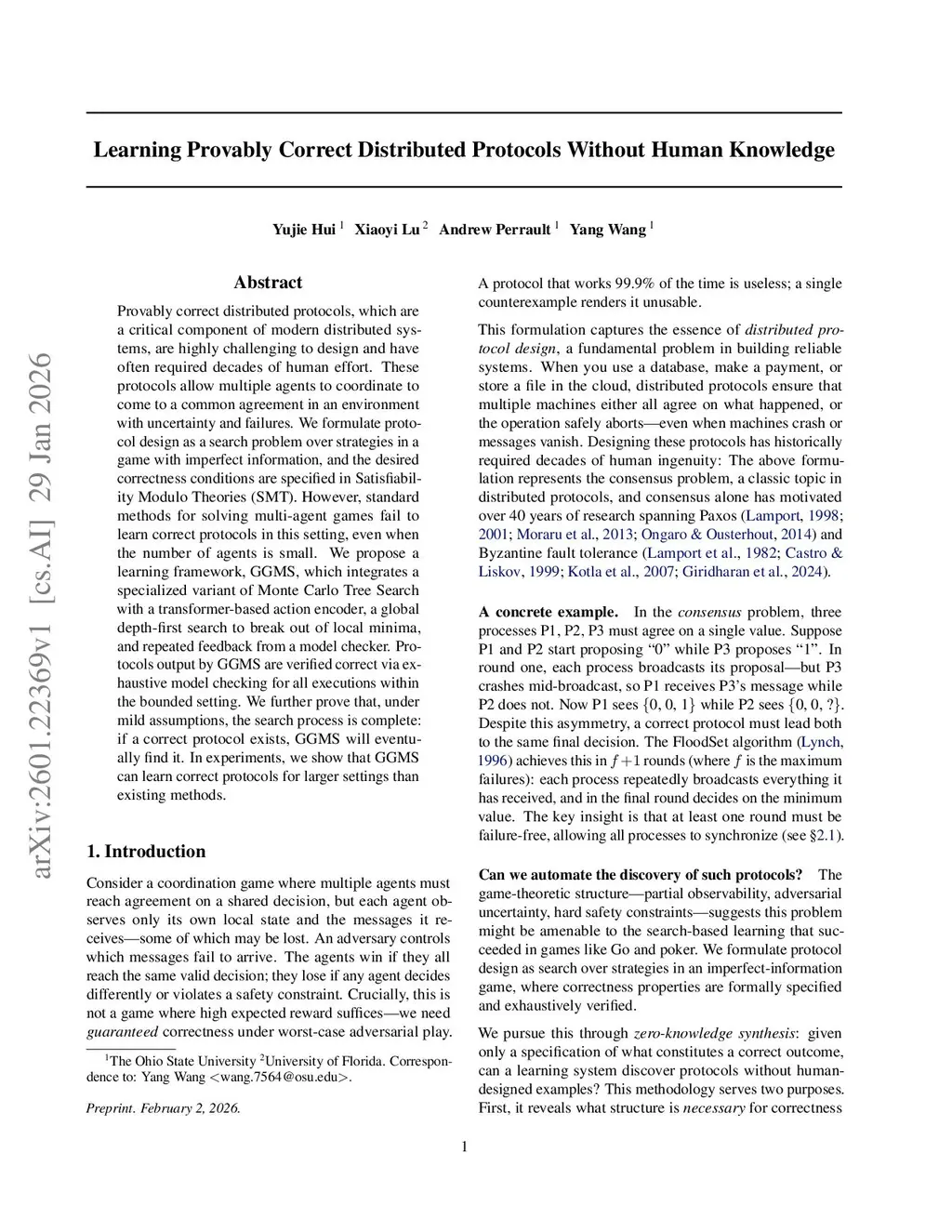 Provably correct distributed protocols, which are a critical component of modern distributed systems, are highly challenging to design and have often required decades of human effort. These protocols allow multiple agents to coordinate to come to a common agreement in an environment with uncertainty and failures. We formulate protocol design as a search problem over strategies in a game with imperfect information, and the desired correctness conditions are specified in Satisfiability Modulo Theories (SMT). However, standard methods for solving multi-agent games fail to learn correct protocols in this setting, even when the number of agents is small. We propose a learning framework, GGMS, which integrates a specialized variant of Monte Carlo Tree Search with a transformer-based action encoder, a global depth-first search to break out of local minima, and repeated feedback from a model checker. Protocols output by GGMS are verified correct via exhaustive model checking for all executions within the bounded setting. We further prove that, under mild assumptions, the search process is complete: if a correct protocol exists, GGMS will eventually find it. In experiments, we show that GGMS can learn correct protocols for larger settings than existing methods.