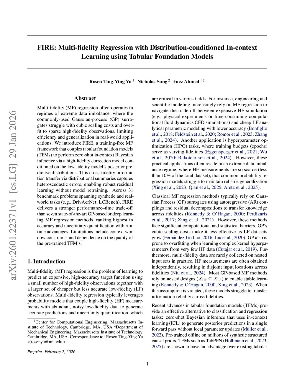 Multi-fidelity (MF) regression often operates in regimes of extreme data imbalance, where the commonly-used Gaussian-process (GP) surrogates struggle with cubic scaling costs and overfit to sparse high-fidelity observations, limiting efficiency and generalization in real-world applications. We introduce FIRE, a training-free MF framework that couples tabular foundation models (TFMs) to perform zero-shot in-context Bayesian inference via a high-fidelity correction model conditioned on the low-fidelity model's posterior predictive distributions. This cross-fidelity information transfer via distributional summaries captures heteroscedastic errors, enabling robust residual learning without model retraining. Across 31 benchmark problems spanning synthetic and real-world tasks (e.g., DrivAerNet, LCBench), FIRE delivers a stronger performance-time trade-off than seven state-of-the-art GP-based or deep learning MF regression methods, ranking highest in accuracy and uncertainty quantification with runtime advantages. Limitations include context window constraints and dependence on the quality of the pre-trained TFM's.