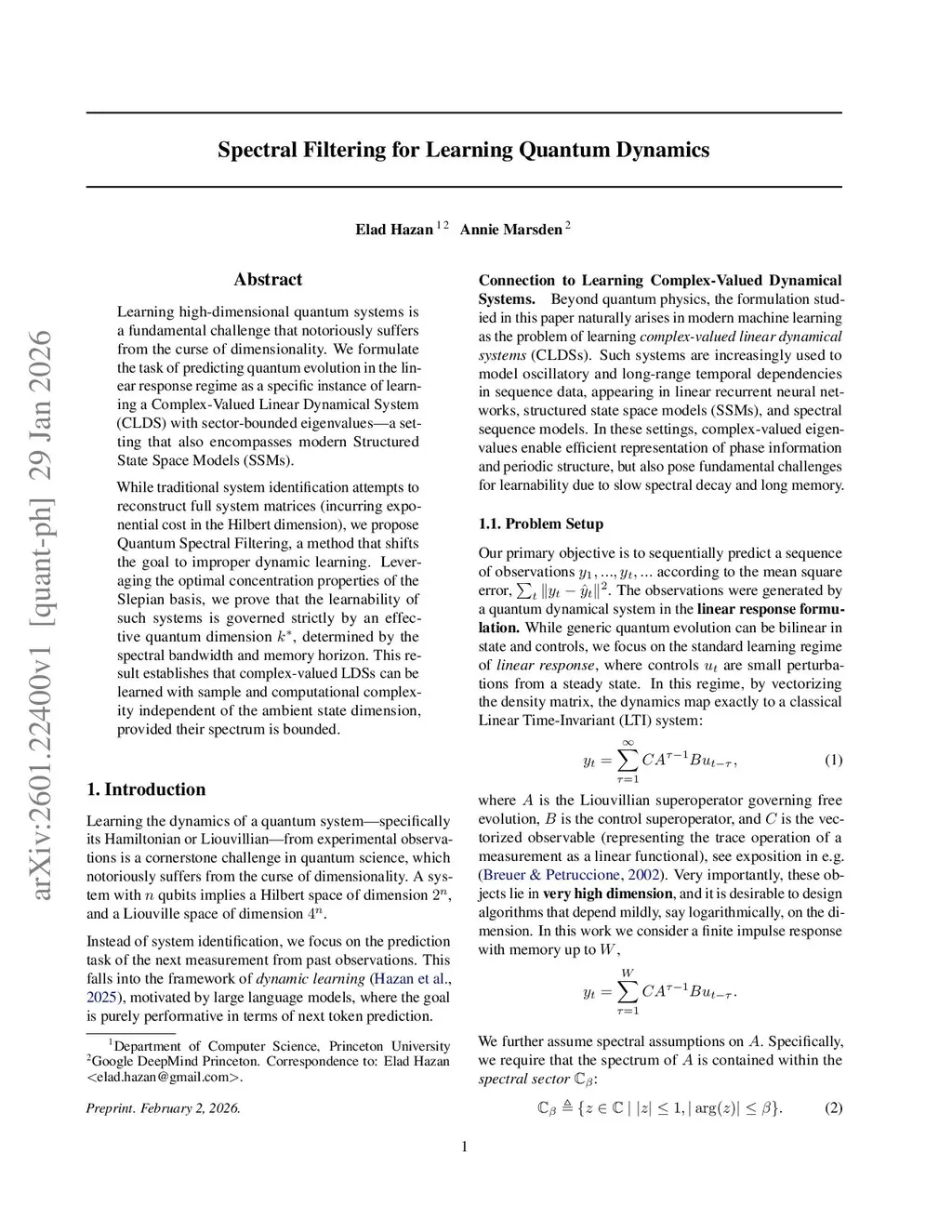 Learning high-dimensional quantum systems is a fundamental challenge that notoriously suffers from the curse of dimensionality. We formulate the task of predicting quantum evolution in the linear response regime as a specific instance of learning a Complex-Valued Linear Dynamical System (CLDS) with sector-bounded eigenvalues -- a setting that also encompasses modern Structured State Space Models (SSMs). While traditional system identification attempts to reconstruct full system matrices (incurring exponential cost in the Hilbert dimension), we propose Quantum Spectral Filtering, a method that shifts the goal to improper dynamic learning. Leveraging the optimal concentration properties of the Slepian basis, we prove that the learnability of such systems is governed strictly by an effective quantum dimension , determined by the spectral bandwidth and memory horizon. This result establishes that complex-valued LDSs can be learned with sample and computational complexity independent of the ambient state dimension, provided their spectrum is bounded.