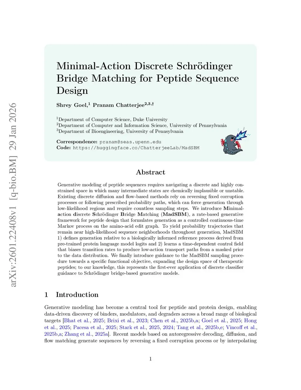 Generative modeling of peptide sequences requires navigating a discrete and highly constrained space in which many intermediate states are chemically implausible or unstable. Existing discrete diffusion and flow-based methods rely on reversing fixed corruption processes or following prescribed probability paths, which can force generation through low-likelihood regions and require countless sampling steps. We introduce Minimal-action discrete Schrödinger Bridge Matching (MadSBM), a rate-based generative framework for peptide design that formulates generation as a controlled continuous-time Markov process on the amino-acid edit graph. To yield probability trajectories that remain near high-likelihood sequence neighborhoods throughout generation, MadSBM 1) defines generation relative to a biologically informed reference process derived from pre-trained protein language model logits and 2) learns a time-dependent control field that biases transition rates to produce low-action transport paths from a masked prior to the data distribution. We finally introduce guidance to the MadSBM sampling procedure towards a specific functional objective, expanding the design space of therapeutic peptides; to our knowledge, this represents the first-ever application of discrete classifier guidance to Schrödinger bridge-based generative models.