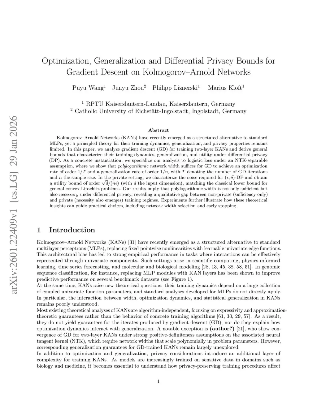 Optimization, Generalization and Differential Privacy Bounds for Gradient Descent on Kolmogorov-Arnold Networks