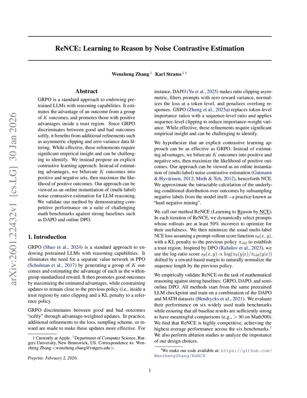 GRPO is a standard approach to endowing pretrained LLMs with reasoning capabilities. It estimates the advantage of an outcome from a group of outcomes, and promotes those with positive advantages inside a trust region. Since GRPO discriminates between good and bad outcomes softly, it benefits from additional refinements such as asymmetric clipping and zero-variance data filtering. While effective, these refinements require significant empirical insight and can be challenging to identify. We instead propose an explicit contrastive learning approach. Instead of estimating advantages, we bifurcate outcomes into positive and negative sets, then maximize the likelihood of positive outcomes. Our approach can be viewed as an online instantiation of (multi-label) noise contrastive estimation for LLM reasoning. We validate our method by demonstrating competitive performance on a suite of challenging math benchmarks against strong baselines such as DAPO and online DPO.