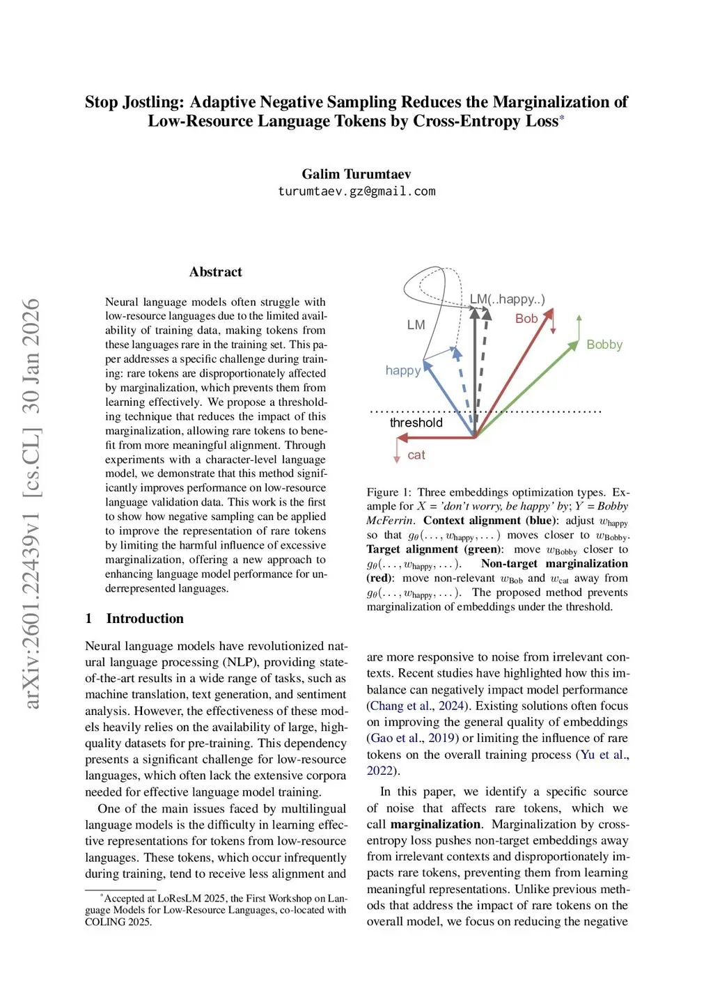 Neural language models often struggle with low-resource languages due to the limited availability of training data, making tokens from these languages rare in the training set. This paper addresses a specific challenge during training: rare tokens are disproportionately affected by marginalization, which prevents them from learning effectively. We propose a thresholding technique that reduces the impact of this marginalization, allowing rare tokens to benefit from more meaningful alignment. Through experiments with a character-level language model, we demonstrate that this method significantly improves performance on low-resource language validation data. This work is the first to show how negative sampling can be applied to improve the representation of rare tokens by limiting the harmful influence of excessive marginalization, offering a new approach to enhancing language model performance for underrepresented languages.